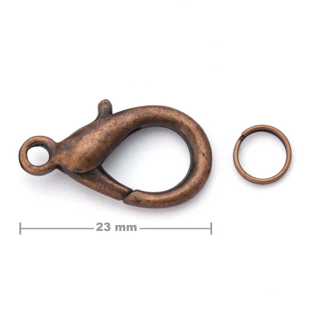 Bižuterní karabinka 23mm staroměď je stejně jako všechny bižuterní karabinky dodávána s pérovým protikroužkem příslušné velikosti, vyznačeným ve fotu produktu.