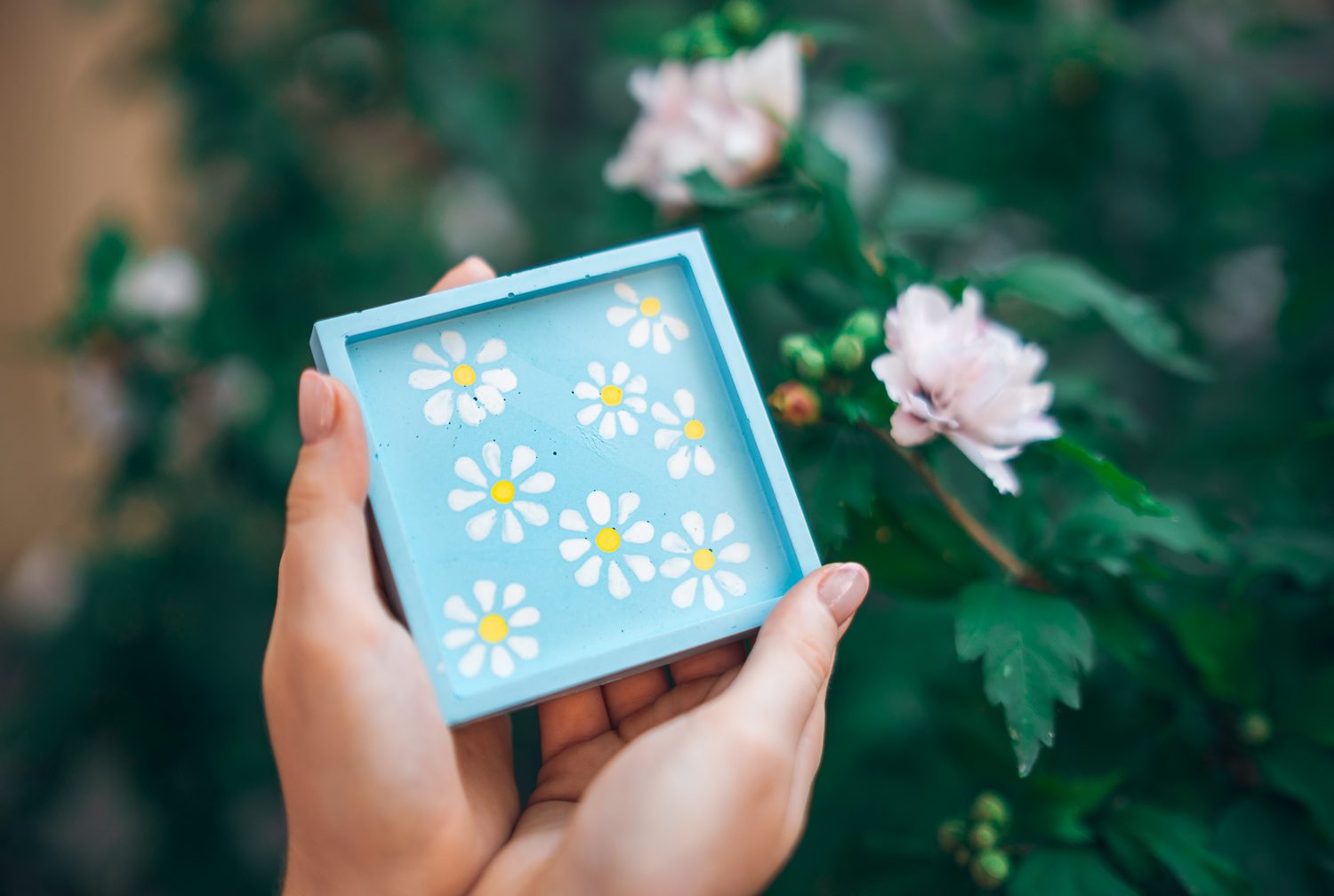 Zkoušeli jste už tvořit s Jesmonite? Vše, co o tom potřebujete vědět si můžete přečíst zde a pak už se můžete pustit do práce. Vytvořit si můžete třeba tento rozkvetlý podtácek se sedmikráskami!
