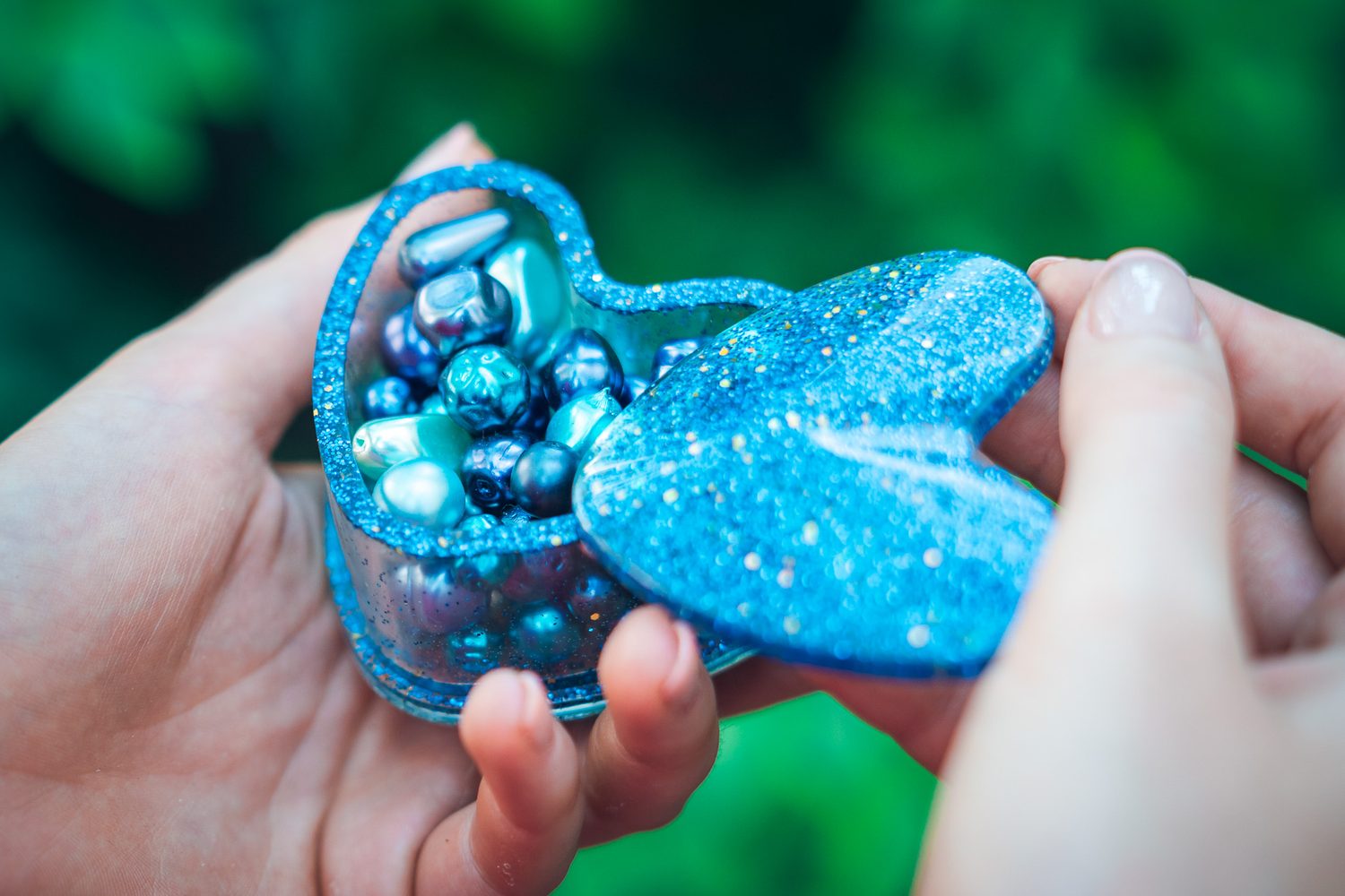 Třpytky a pryskyřice k sobě prostě ladí. Hezky si to můžete ozkoušet třeba na této krabičce ve tvaru srdce, kterou můžete použít jako šperkovnici nebo na schování zamilovaného vzkazu!