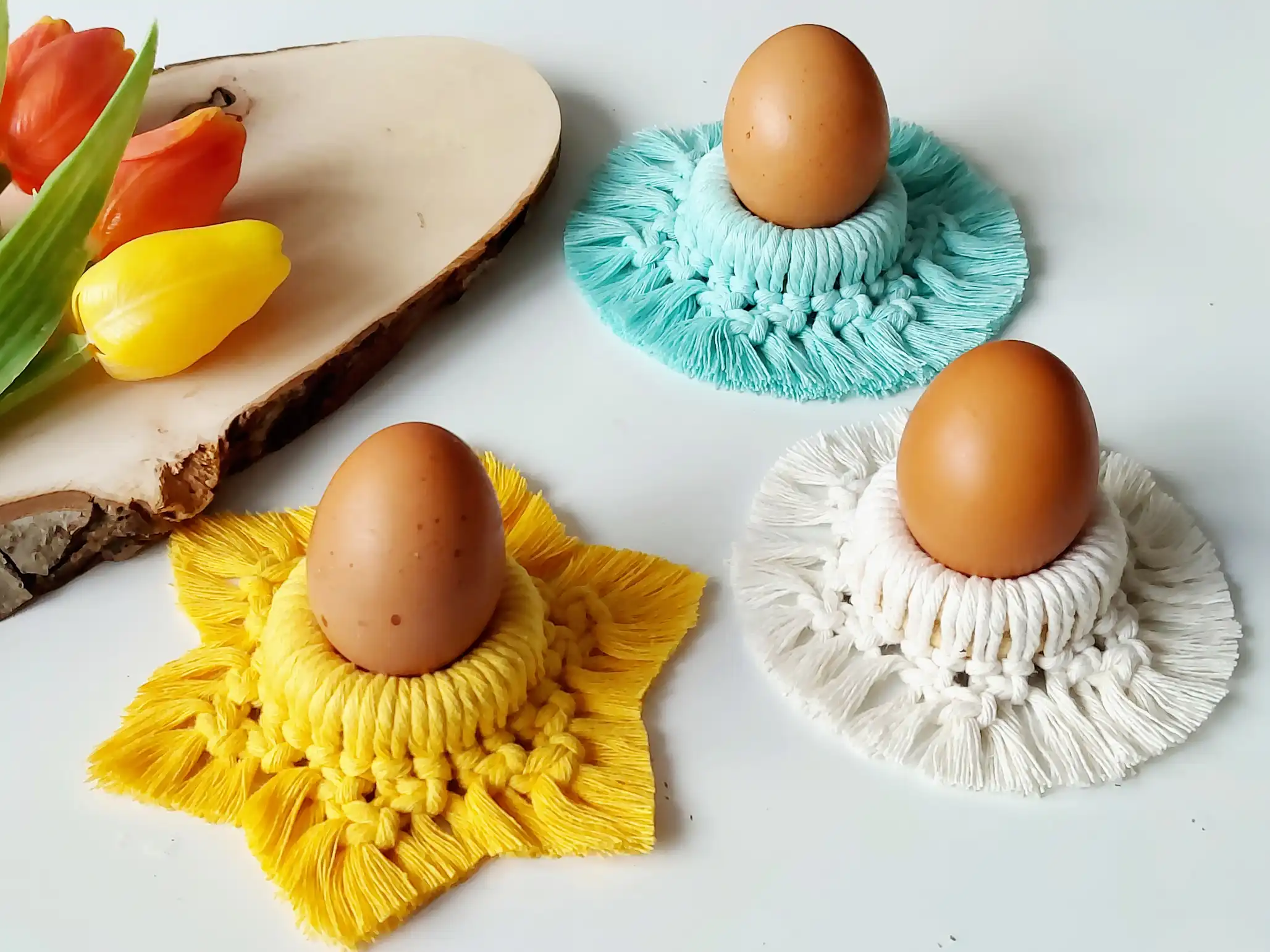 Uplěťte si z macramé originální stojánky na vajíčka nebo kraslice! Vybrat si můžete z nepřeberného množství barevných variant macramé přízí, takže můžete stojánky barevně doladit jak k vajíčkům, tak k vaší velikonoční výzdobě.