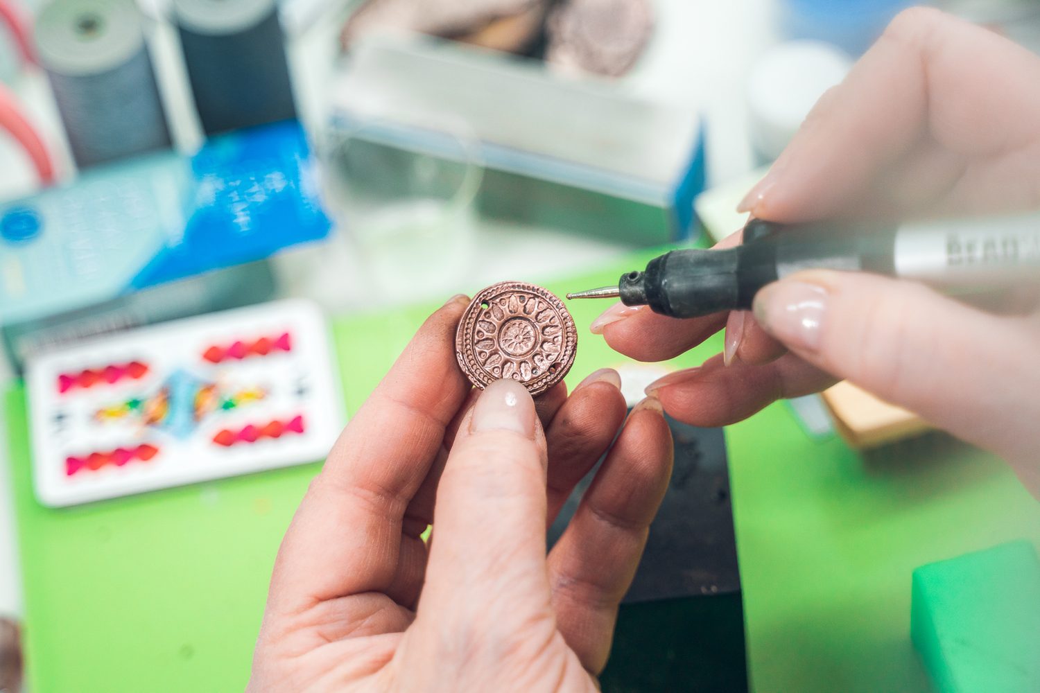 Každý šperk si musíme upravit tak, aby se dobře nosil, přesněji – aby se vůbec dal nosit. U závěsů a náhrdelníků je tím nejjednodušším uchycením dírka s očkem nebo nýtkem. Různí autoři přistupují k vrtání dírek odlišně. Někdo je dělá do vlhké hlíny rovnou, někdo do suchého šperku, jiný až po vypálení. Já si dírky předem vyznačím, lehce hlínu za vlhka propíchnu a uhladím. Za vlhka proto, aby se od dírky nevytvořily trhlinky. Po vysušení dovrtám jemným vrtáčkem. Propíchnout ji můžeme špejlí, kovovou jehlicí nebo párátkem. Po vypálení velikost dírky upravíme pilníčkem. Protáhneme stříbrné očko a buď jenom dovřeme, nebo spoj sletujeme stříbrnou pájkou. Dírkou můžeme protáhnout nýtek a nad okrajem šperku drátek stočíme.