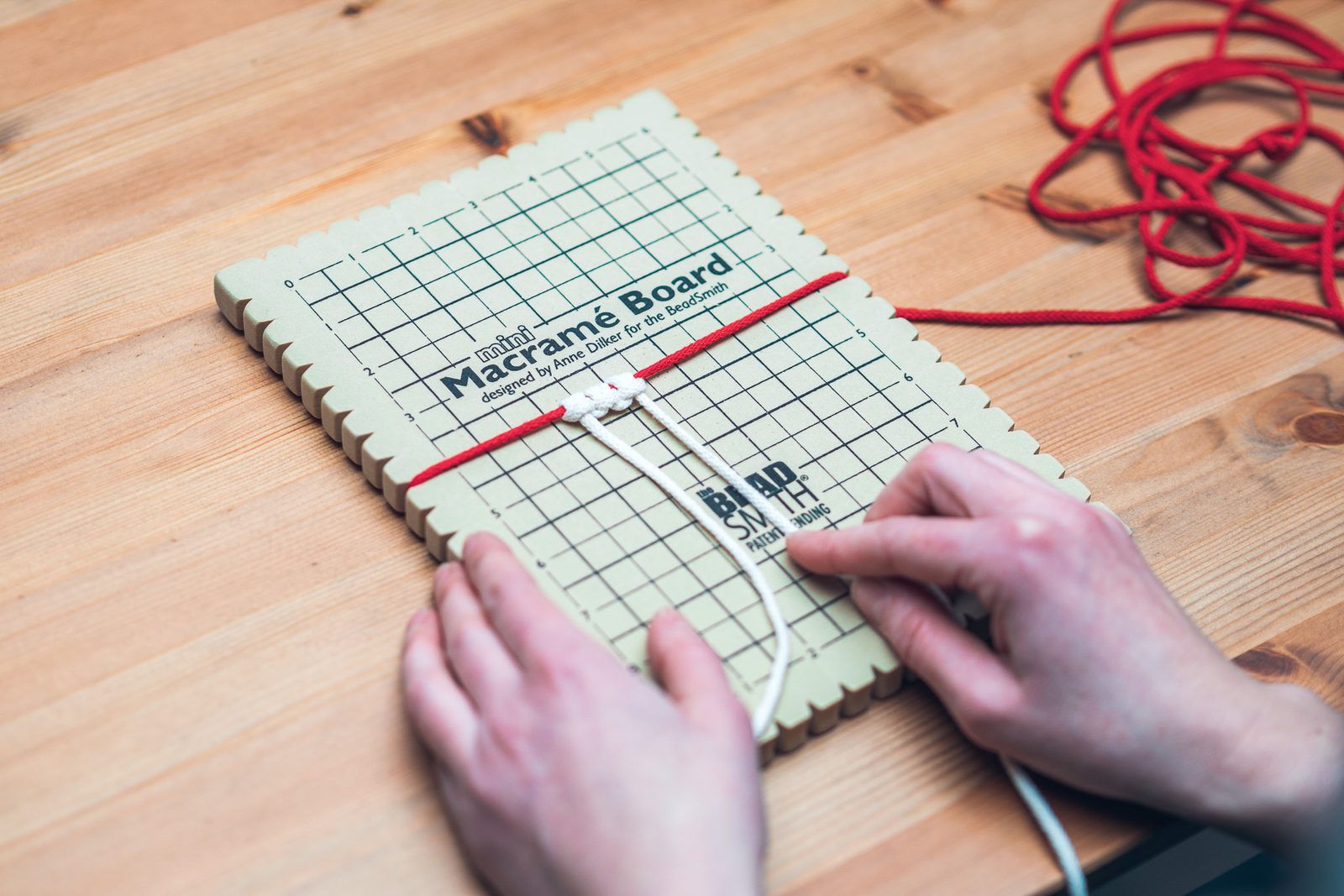 Pokud máme vybranou správnou přízi na náš projekt, můžeme začít drhat. Abychom si práci usnadnili, máme na výběr z několika pomocníků. Na menší projekty, jako šperky nebo oblíbené andílky, nám velmi dobře poslouží macramé podložka, ke které můžeme náš projekt snadno zachytit pomocí špendlíků nebo za výřezy na krajích samotné desky. Podložka má hladký povrch a je vyrobena z EVA pěny, která se po vpichu opět vrátí do původního stavu. S touto podložkou nám půjde práce hezky od ruky.