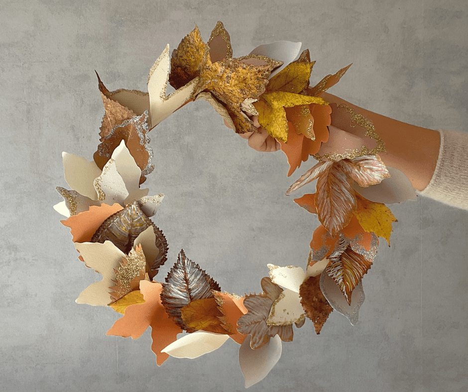 Kombinace papírových listů a těch opravdových posbíraných na procházce je přesně to, co dělá tento věnec tak originálním! Jak ty papírové, tak i ty přírodní můžete stylově dozdobit akrylovými barvami nebo spreji. Například ty v metalických barvách vypadají opravdu skvěle.