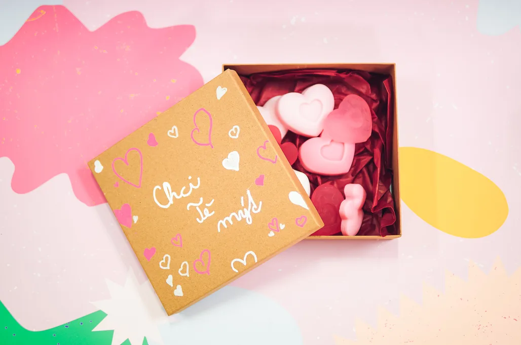 Návod na výrobu kouzelné mýdlové bonboniéry s “bonbonky” ve tvaru srdce je opravdu jednoduchý. Kromě odlití mýdlíček bude na vás hlavně vymyslet, jak kreativně ozdobit krabičku. K tomu můžete použít akrylové popisovače, washi pásky, originální výřezy ve tvaru srdíček nebo třeba nalepovací kamínky.