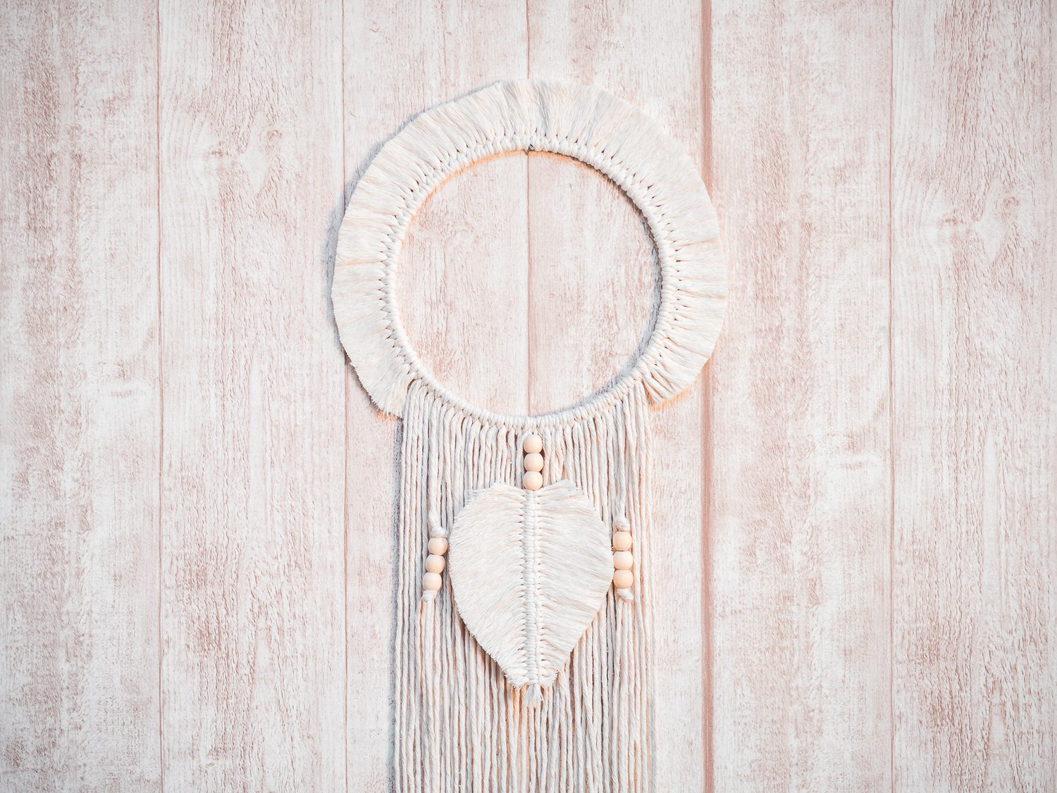 V této sadě najdete přízi v natural barvě, korálky a dřevěné kroužky pro uchycení závěsu. Pro výrobu budete dále opět potřebovat nůžky a hřeben/kartáč na rozčesání příze.