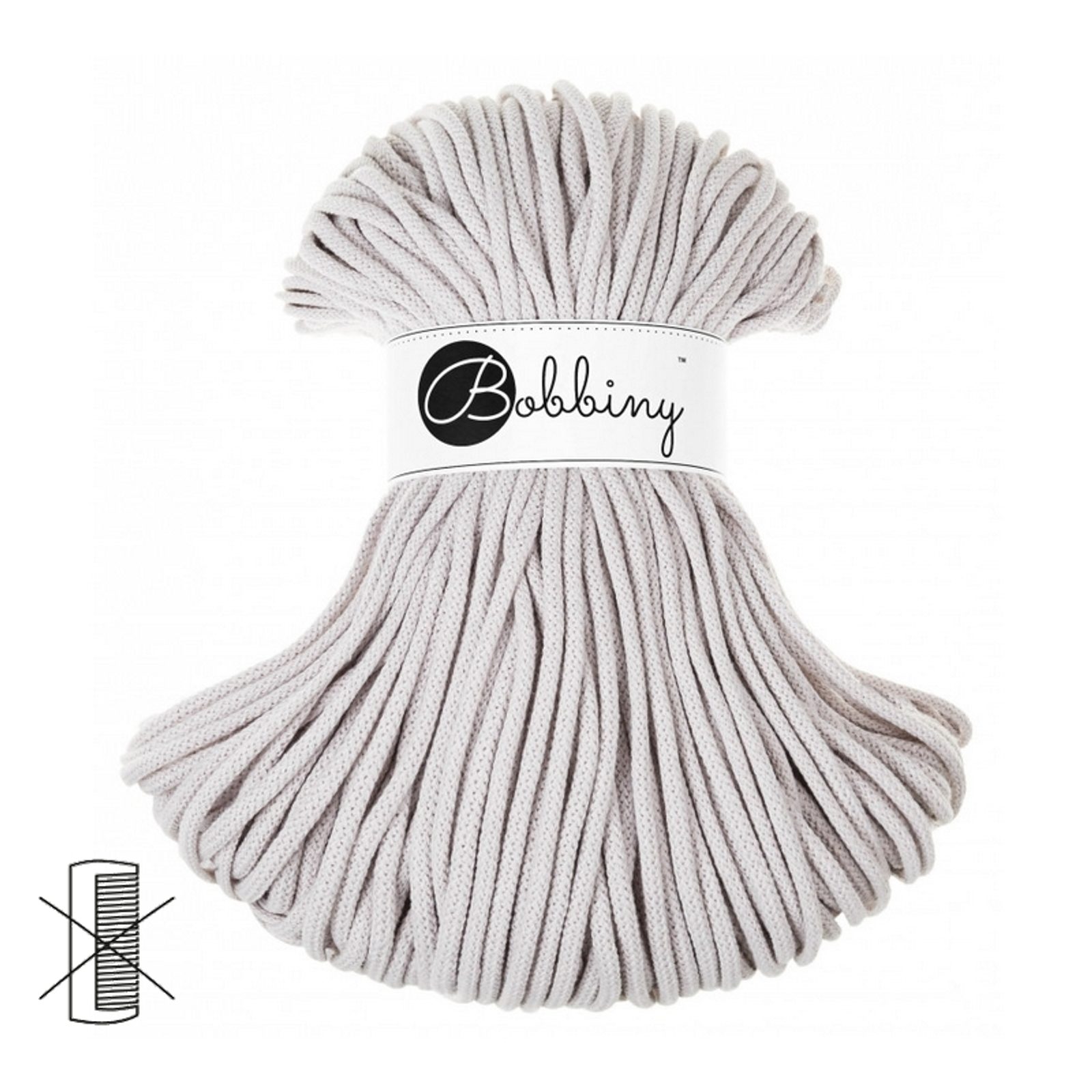 Bobbiny Macramé šňůra Premium 5mm Moonlight je splétaná šňůra vyrobena z recyklované bavlny, technikou splétání s pevným bavlněným jádrem. Splétaná šňůra nelze rozčesat. Je vhodná pro háčkování i pletení s háčkem o velikosti 8 - 10 mm. Díky své pevnosti se používá pro hutnější dekorace i užitné předměty, jako jsou košíky, prostírání, koberečky nebo kabelky či tašky.