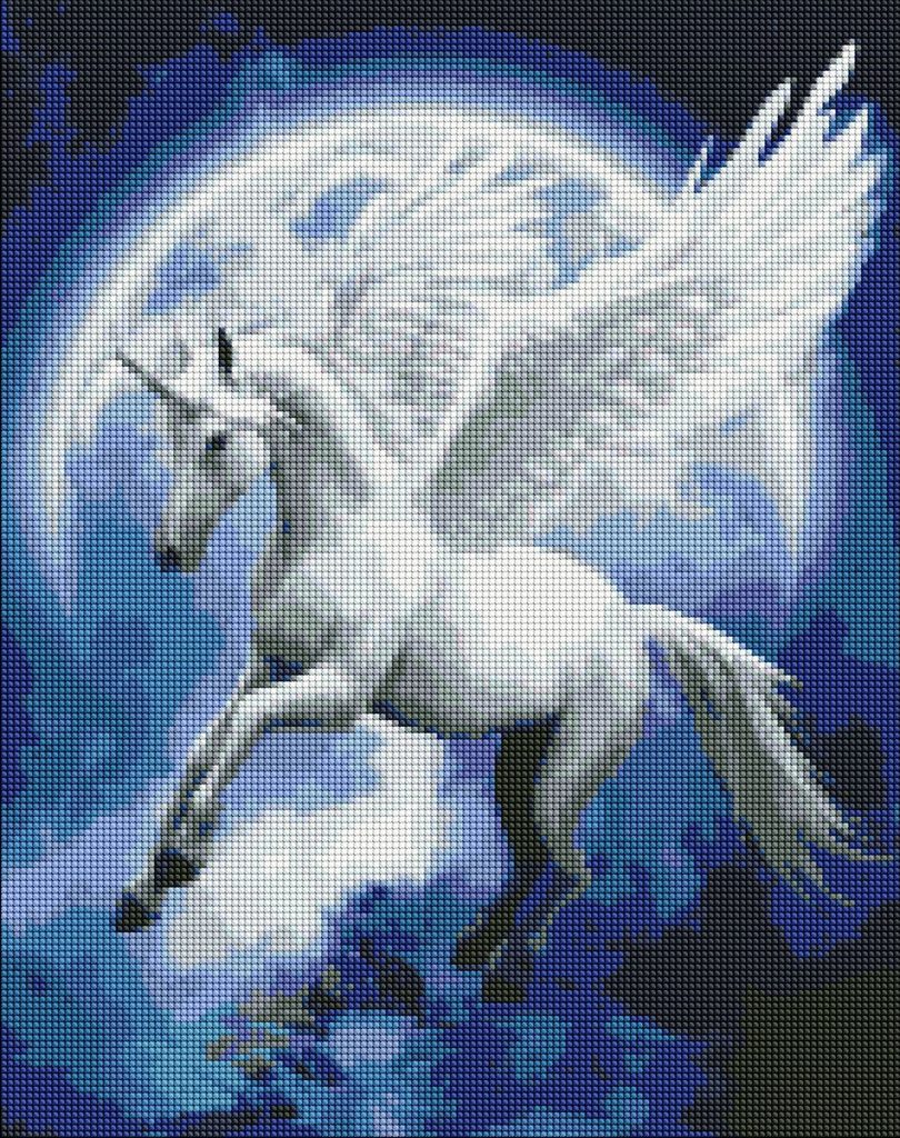 Vytvořte si obraz s motivem okřídleného jednorožce technikou diamantového malování, tedy lepením barevných kamínků na předtištěný vzor. Aplikování kamínků je snadné. Na plátně jsou čísly označené jednotlivé barvy, které je třeba použít a stejně tak jsou označeny pytlíčky s kamínky příslušné barvy.
