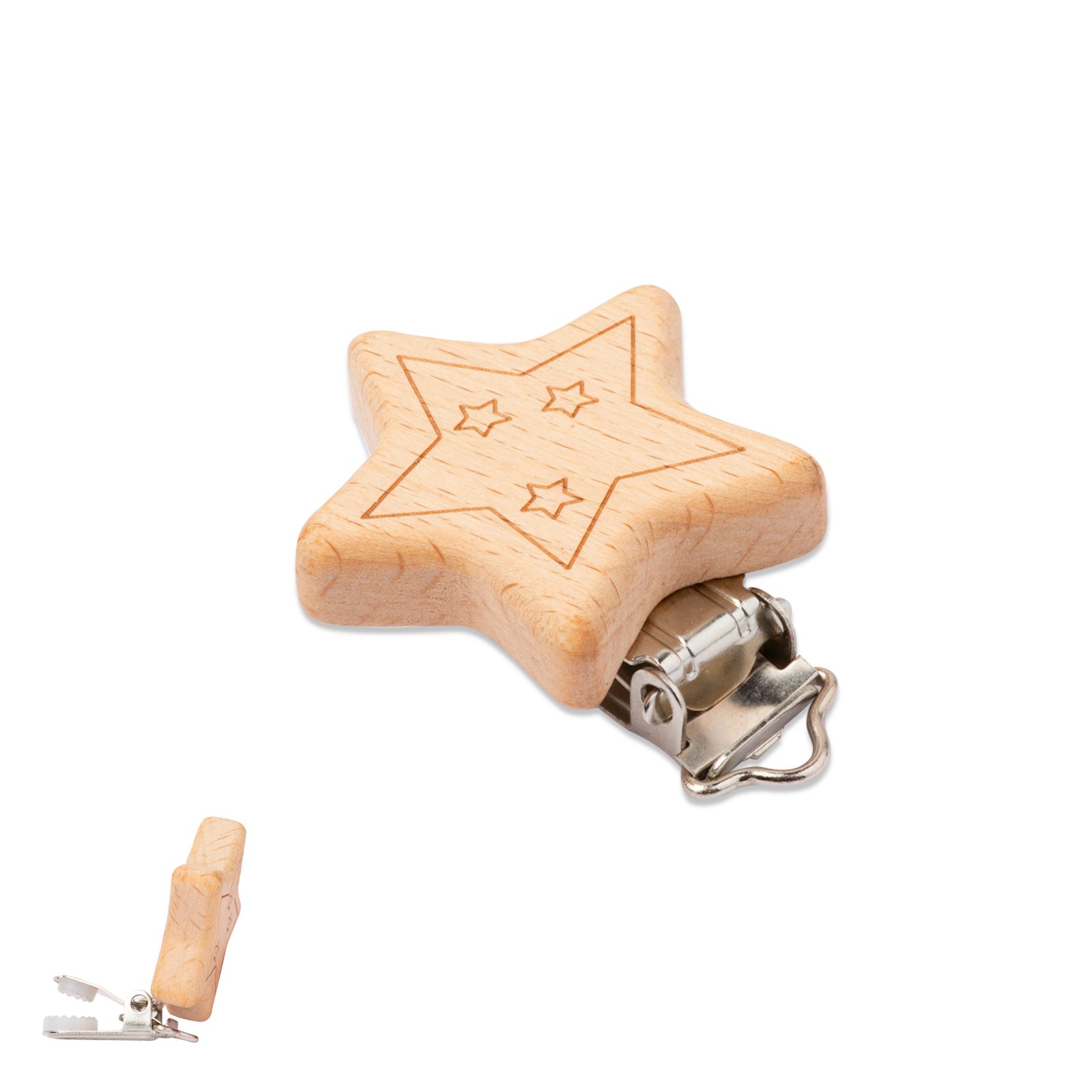 Dřevěný klip na dudlík 41x41x10mm hvězdička s kovovou sponou je doplněk určený k tvorbě ozdobných řetízků na dudlík pro miminka. Klip můžete snadno připnout na dětské oblečení a pomocí nylonové saténové šňůry a dřevěných nebo silikonových korálků vytvořit krásný a praktický doplněk, který zajistí, že už nebudete muset hledat dudlík pro své miminko všude po domě. Kovová spona je vytvořena z běžného kovu, a proto je nutné o ni pečovat, aby zůstávala suchá a čistá, jelikož by mohla zreznout. Je však pevnější než spony z jiných materiálů.