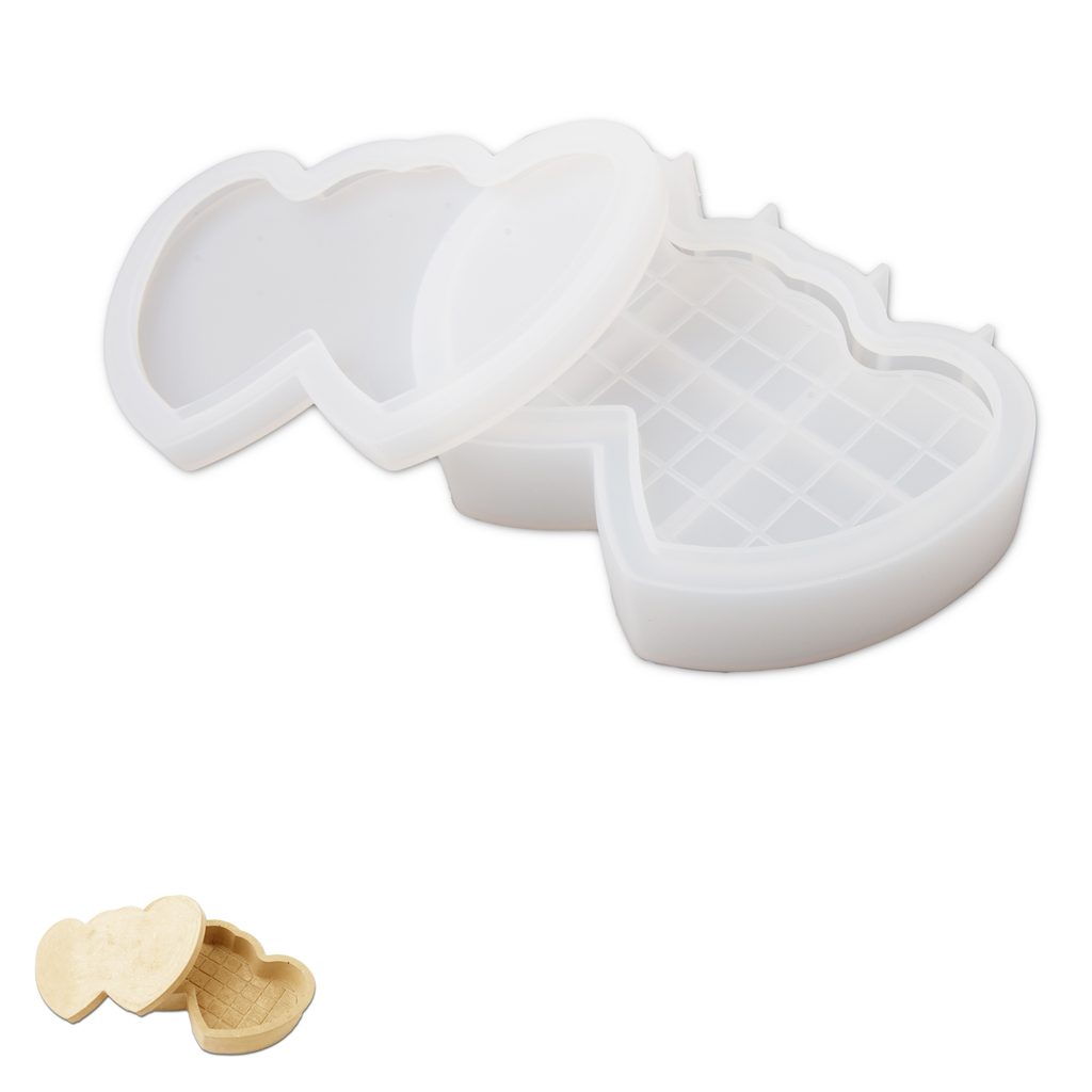 Dvoudílná silikonová forma na krabičku s víčkem ve tvaru dvojtého srdce o rozměru 160 x 100 x 45 mm je ideální na odlévání z křišťálové pryskyřice nebo hmoty Jesmonite a slouží k opakovanému použití. Odlitek z formy vám poslouží jako krásná dekorace i jako funkční doplněk. K prodloužení životnosti formy doporučujeme před procesem vylévání naaplikovat na formu separátor.