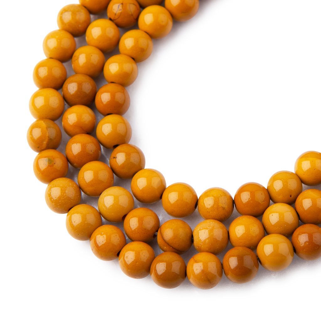 Jaspis Mookait žlutý (yellow mookaite jasper) ve velikosti 6 mm údajně pomáhá svému nositeli obnovit vitalitu a posílit tělo a mysl. Má nahnědlou barvu se žlutým odstínem. Ten může být jasně žlutý, nazelenalý nebo oranžový. Tento kámen prý podporuje rozhodnost a odhodlanost. Říká se, že pomáhá překonávat překážky, odstraňovat strachy a obavy spojené s novými začátky. Podle legend bývá vyhledáván pro navazování hlubšího spojení s přírodou. Umožňuje tak prý lidem lépe rozumět cyklům a změnám života. Každý korálek je originál, a proto se může lišit o cca 0,5 mm. Více o jaspisu Mookait žlutém si přečtěte v našem článku o jaspisu.