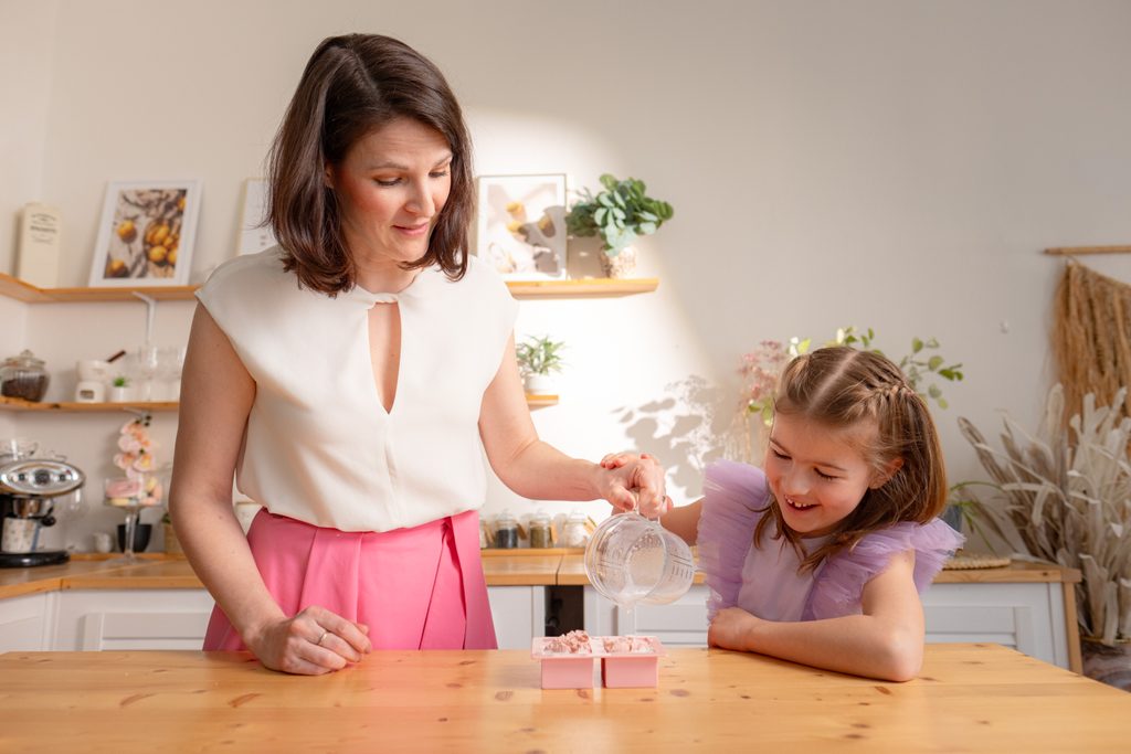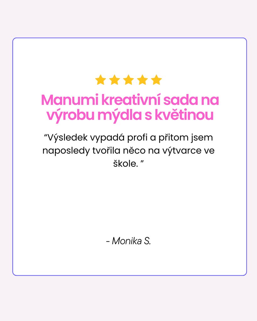 | Doplňující info | Ze sady můžete vyrobit 25 mýdel; Obsah balení: bílá a transparentní mýdlová hmota, žluté, tyrkysové a růžové barvivo do mýdla, vonná esence, silikonová forma s motivy zvířat a návod |