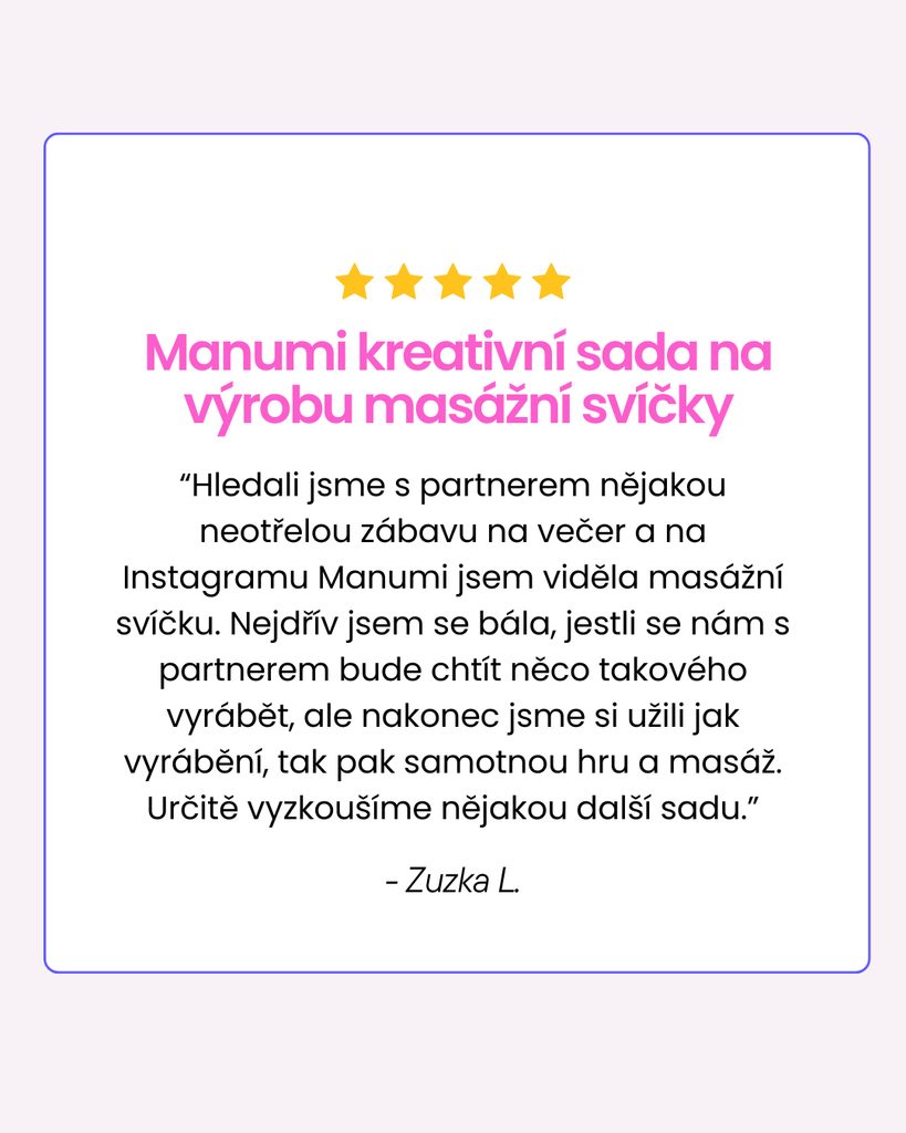 | Doplňující info | Obsah balení: sójový vosk na masážní svíčky, knot do svíčky, centrovací držák knotu, nádoba na svíčku s víčkem, vonná esence levandule, bílý akrylový fix, dřevěná kostka a návod |