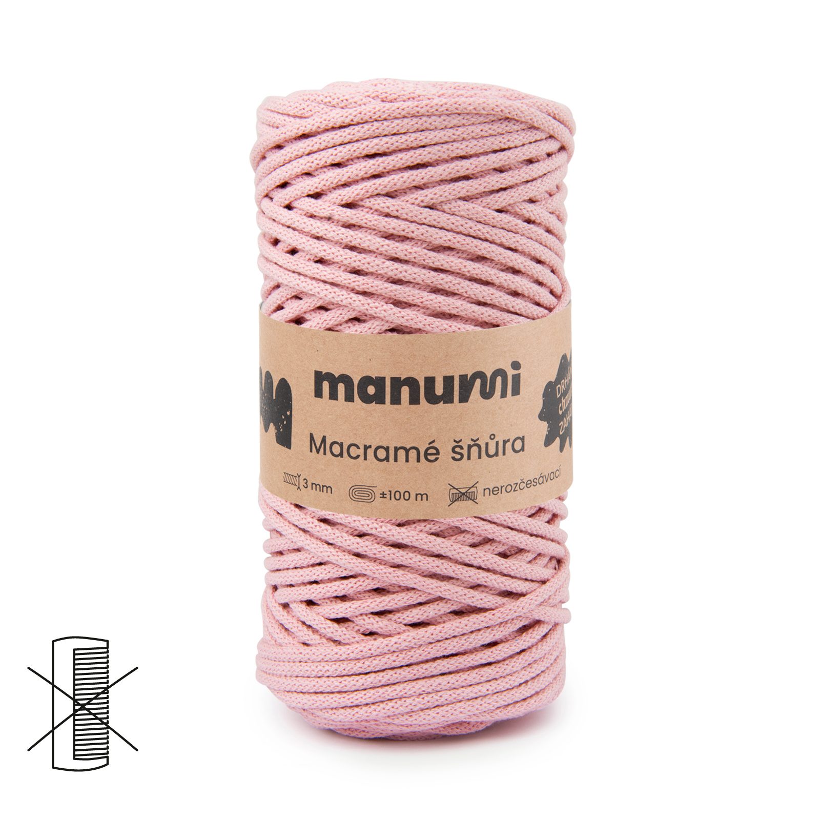 Manumi Macramé šňůra ve světle růžové barvě, s tloušťkou 3 mm a délkou 100 m. Šňůra obsahuje polyesterové jádro, což šňůru dělá odolnější, pevnější v tahu a zachovávající tvar výrobku. Ideální pro háčky 5 - 8 mm (čím menší je háček, tím je výrobek tužší). Šňůra má certifikát bezpečnosti textilu OEKO-TEX Standard 100.