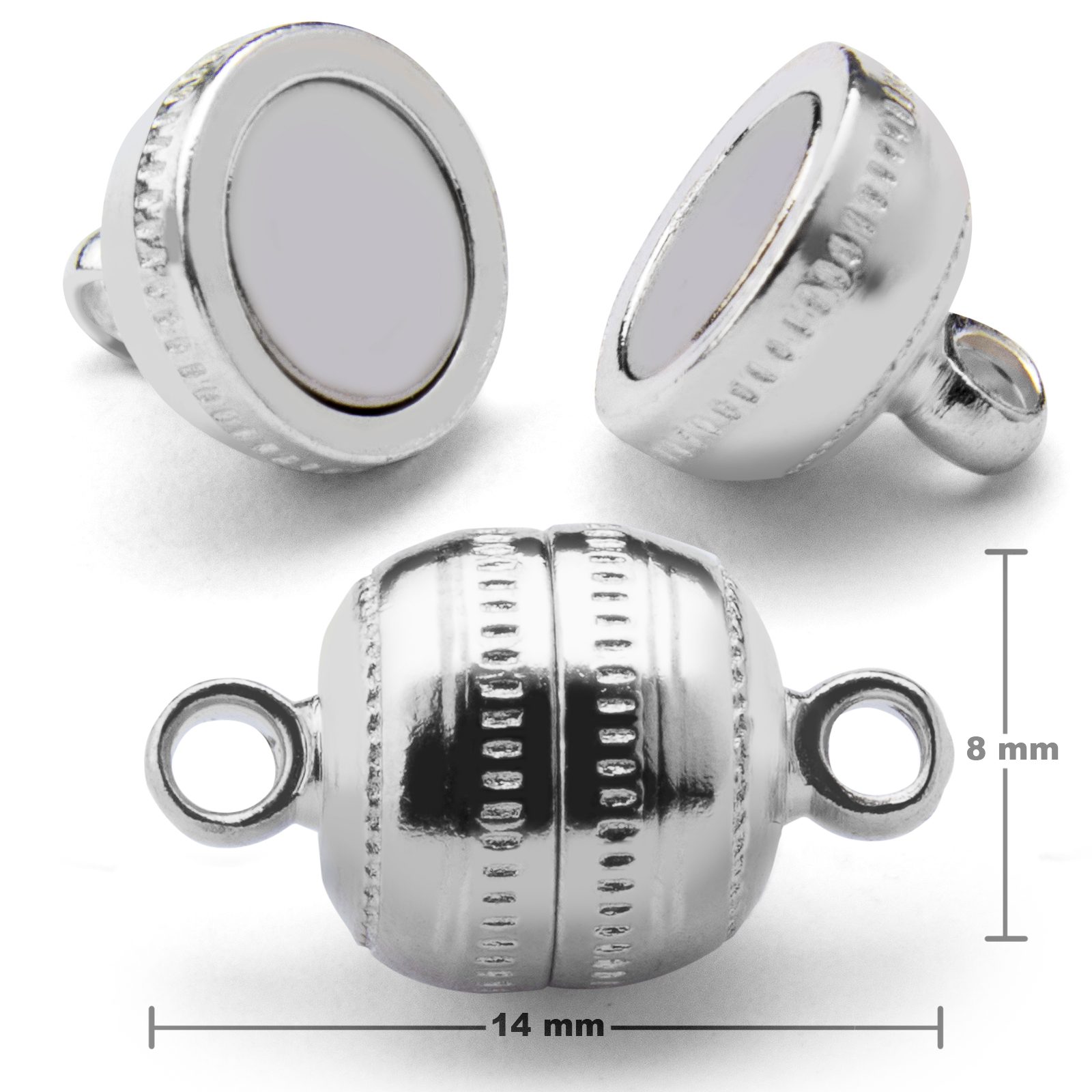 Magnetické zapínání soudek 14x8mm v barvě platiny je v podstatě nesmrtelným bižuterním zapínáním bez jakýchkoliv letovaných nebo spojovaných částí. Vůči své velikosti jsou tyto záponky vysoce magnetické a velice pevné v tahu.