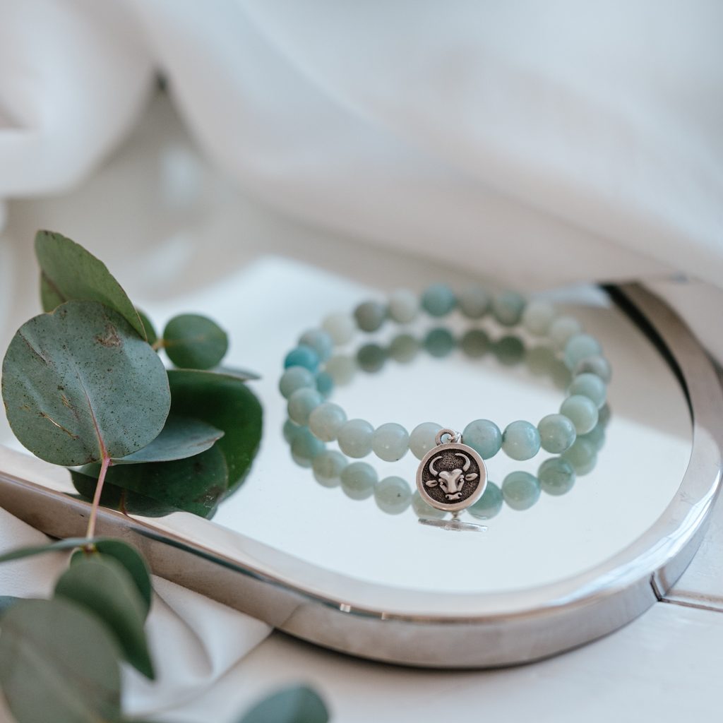 Ze sady můžete vyrobit 1 minerální náramek pro znamení zvěrokruhu Býk/Taurus s originálním přívěskem s motivem tohoto znamení v barvě stříbra.