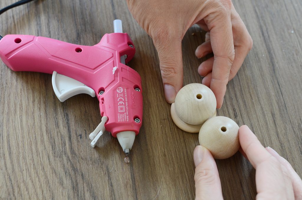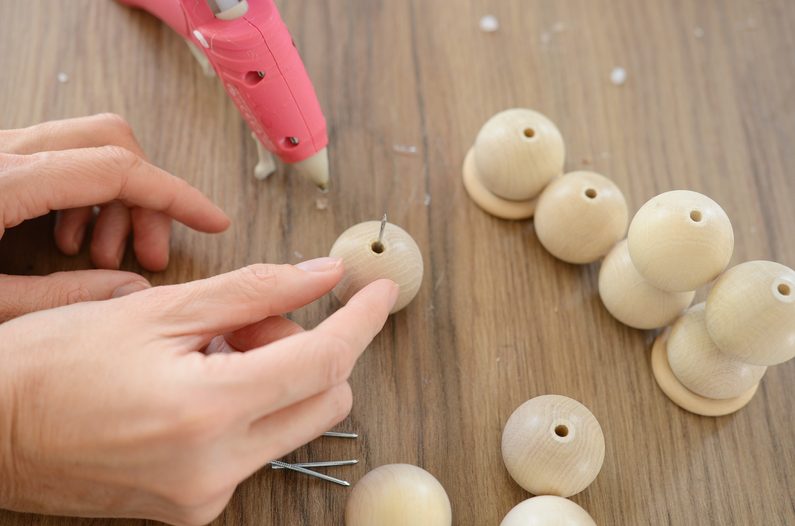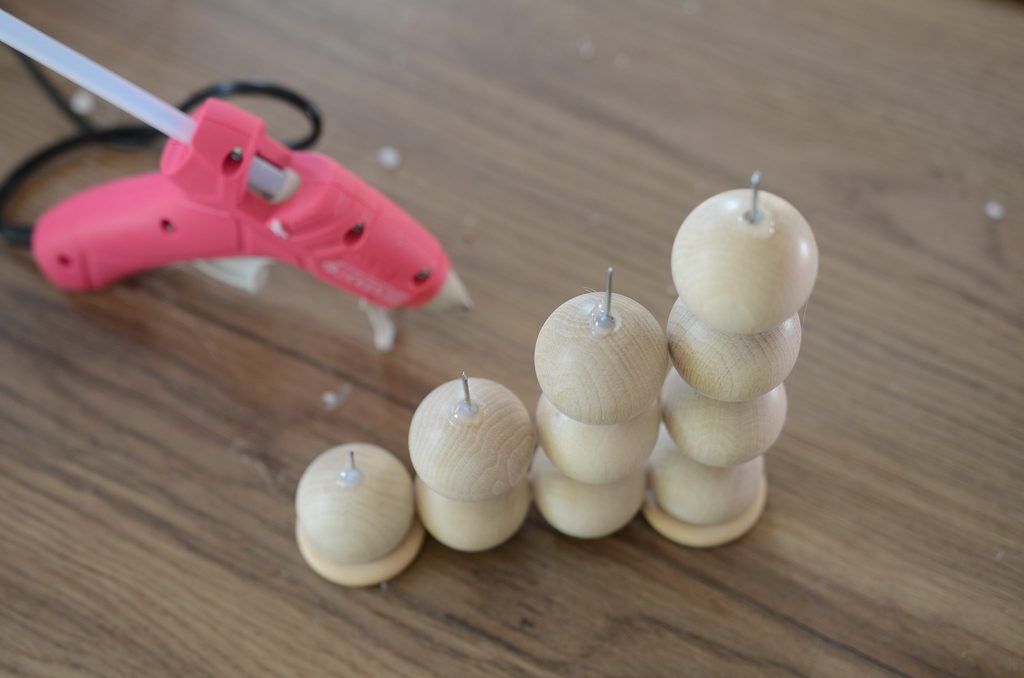Do dírky vrcholového korálku naneste trochu lepidla, ponořte část hřebíčku hrotem nahoru a nechte zaschnout. Postup zopakujte u dalších tří vrcholových korálků.