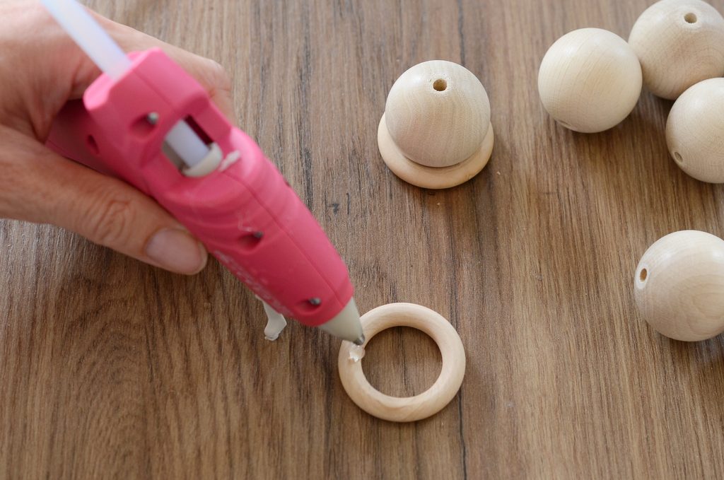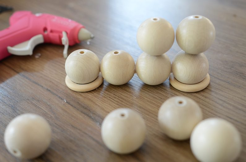 Na vnitřní stranu kroužku naneste trochu lepidla a přilepte první korálek. Stejně vytvořte ještě jednu nosnou část základny svícnu.