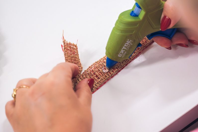 Naměříme si 5 x 8 metrů macramé šňůry a jejich konce přilepíme tavnou pistolí na spodní stranu dřevěného kruhu.