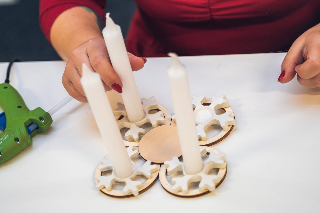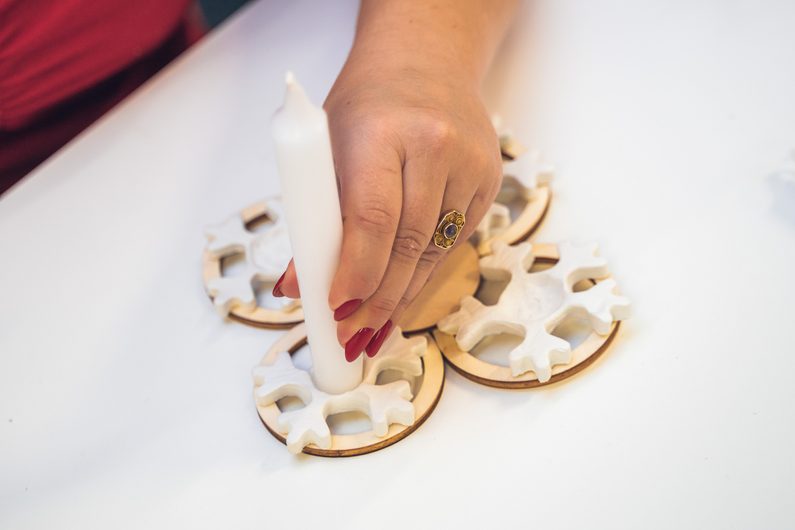 Vločky necháme minimálně 24 hodin vytvrdnout a poté je přilepíme tavnou pistolí na konstrukci, kterou jsme si připravili dříve. Stačí připevnit svíčky a je hotovo.