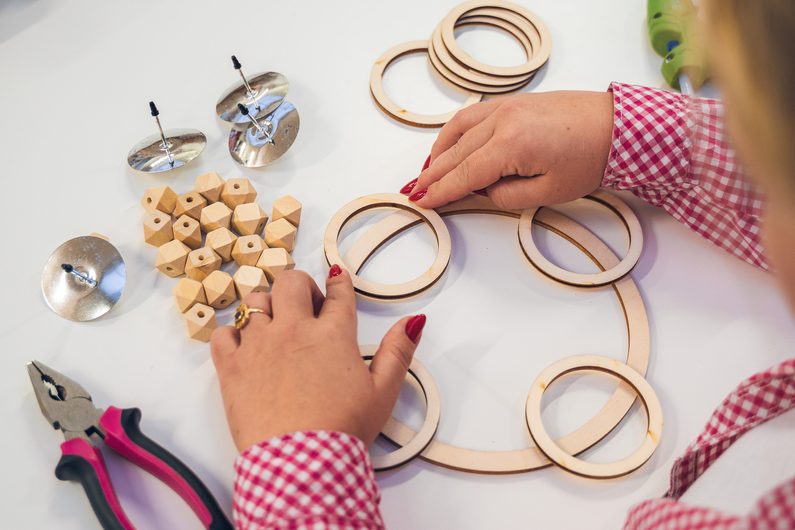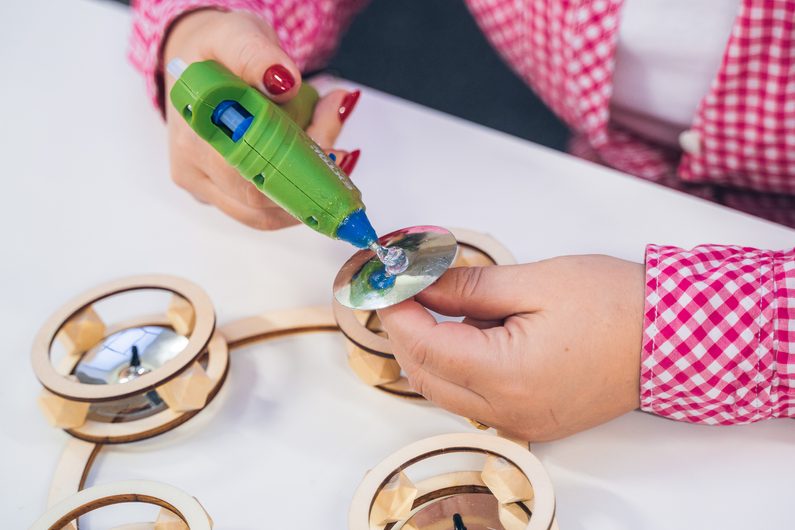 Na velký kruh rovnoměrně rozložíme malé kroužky a přilepíme je pomocí tavné pistole.