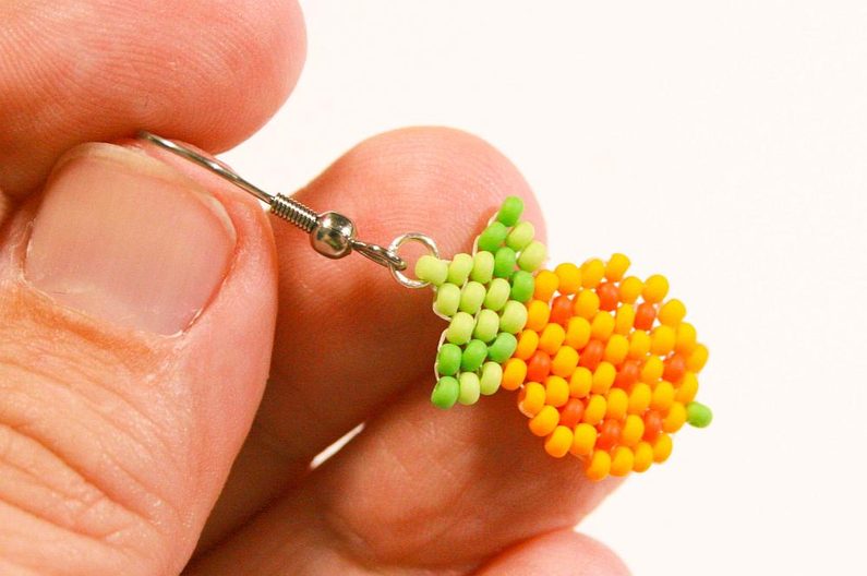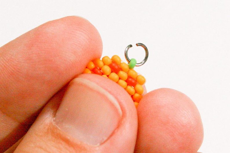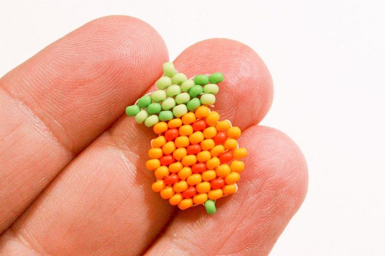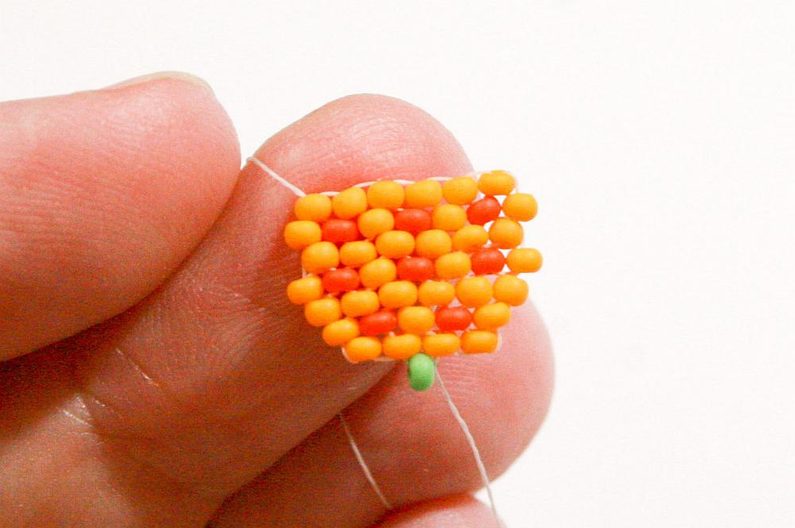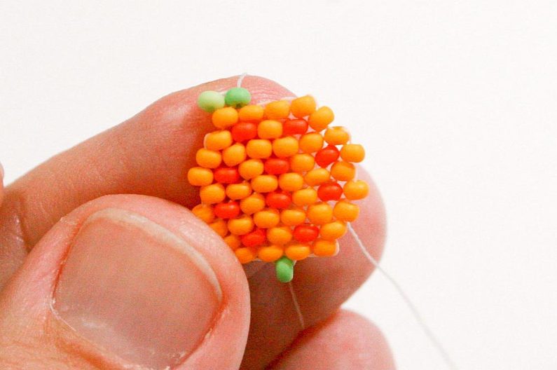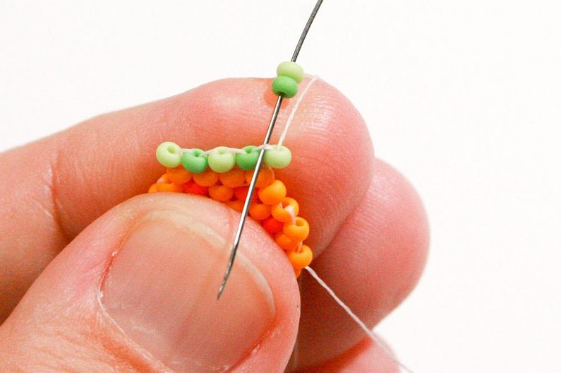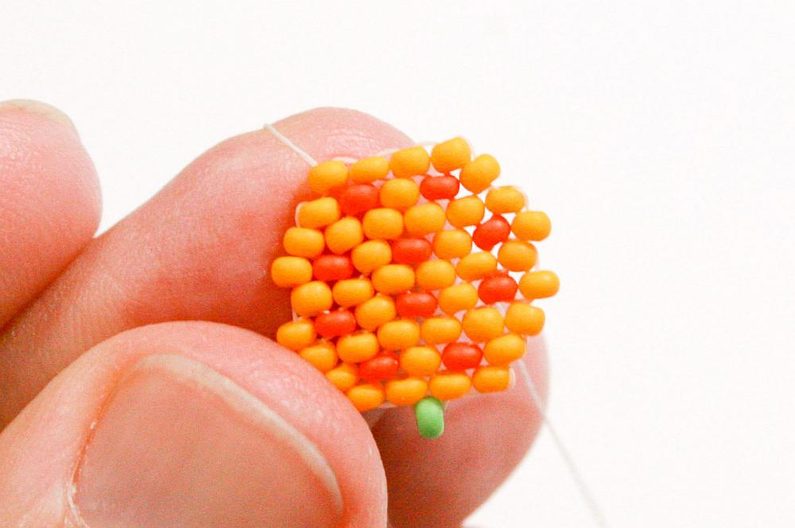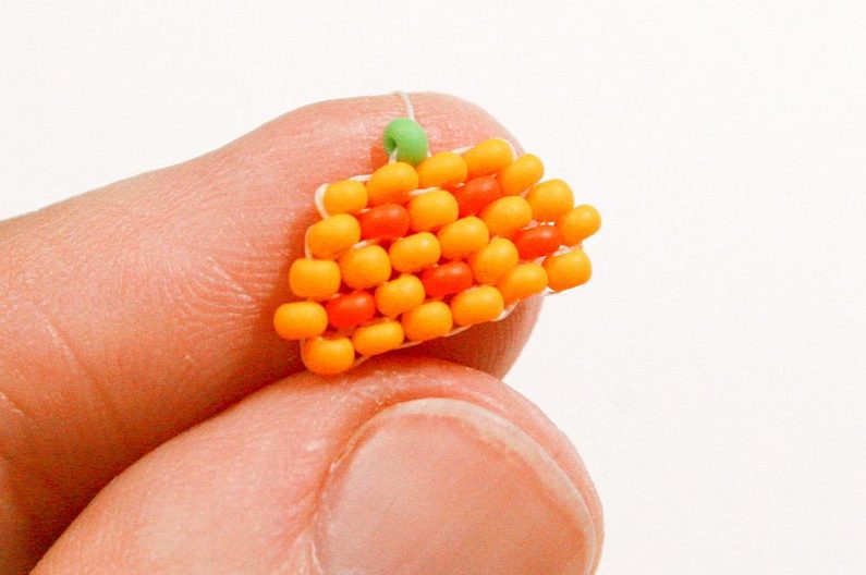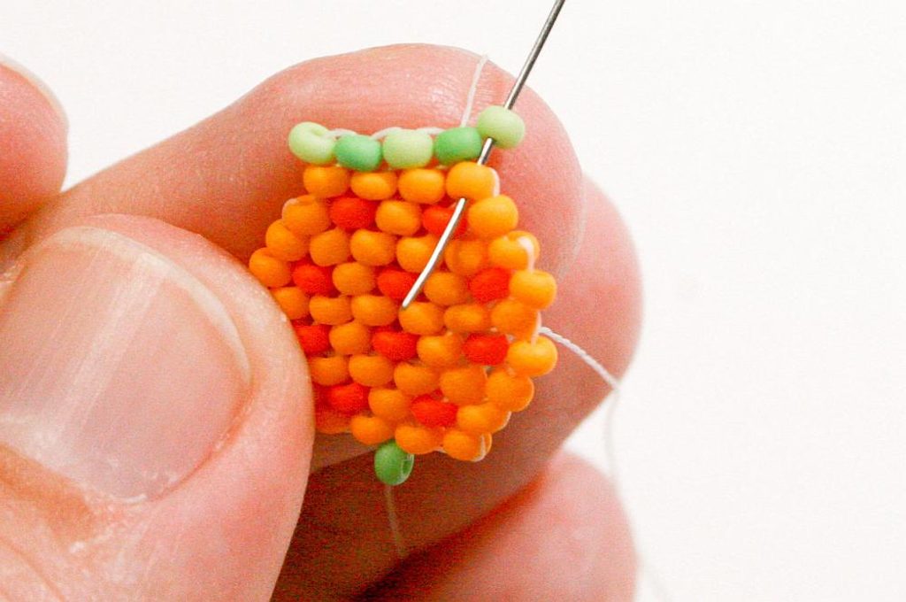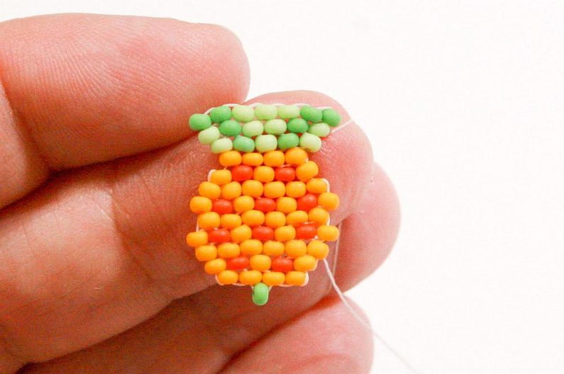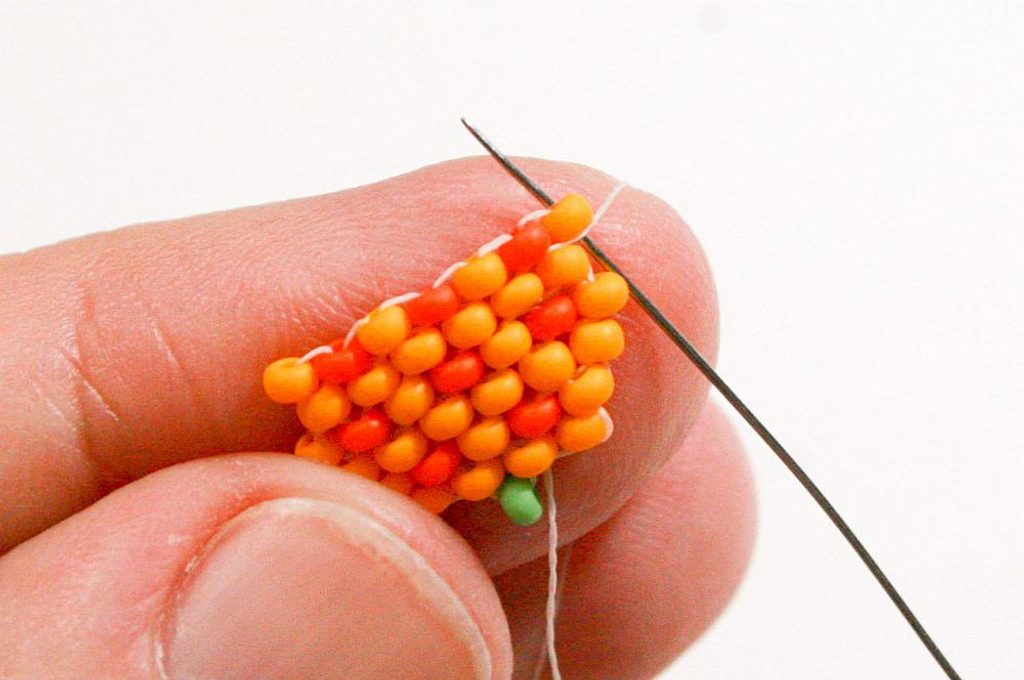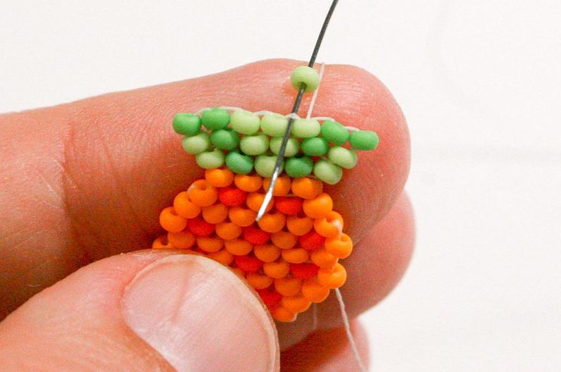 Propracujte se skrz korálky do třetího korálku (Obr. 42). Navlékneme korálek PR10b, projdeme jehlou pod nitkou předchozí řady, dále projdeme skrz tento korálek směrem nahoru, stejněépřidáme ještě jeden korálek (Obr.43-44). Mezi korálky v poslední řadě všijte jeden zelený (Obr. 45–46). Ananas máme hotový a teď ho můžeme zpracovat do náramku.