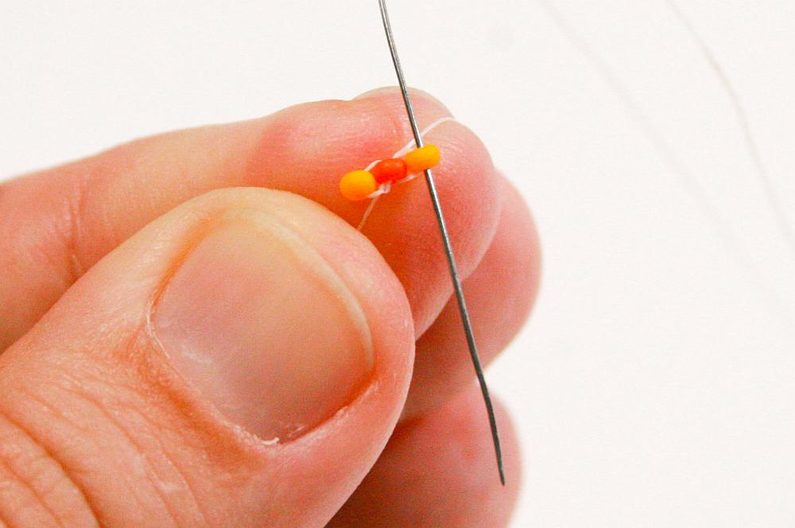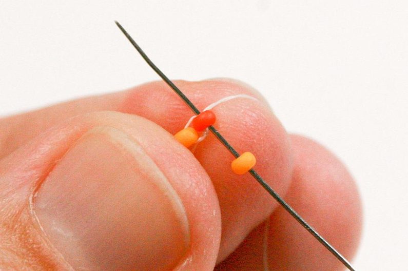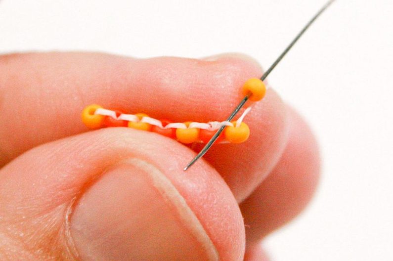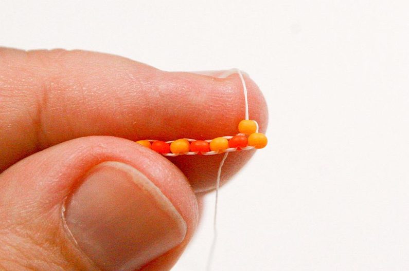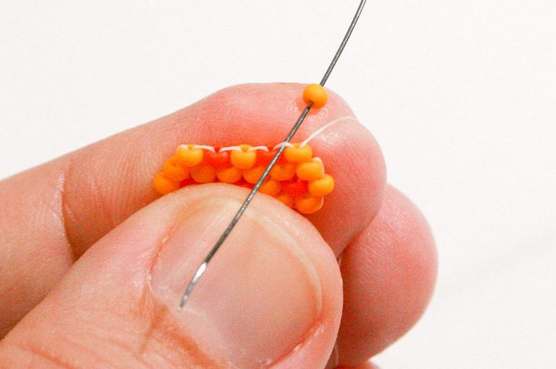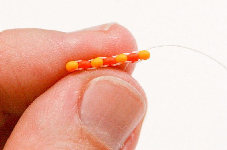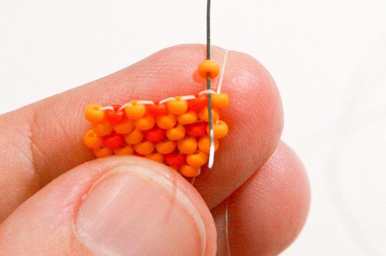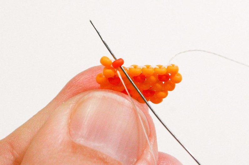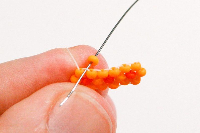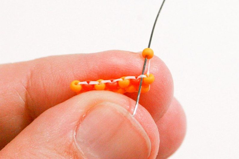 Nabereme PR10d a projdeme jehlou pod nitkou předchozí řady, dále projdeme skrz tento korálek směrem nahoru (Obr. 7–9).