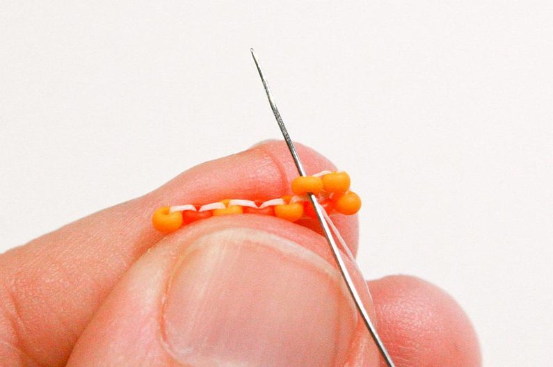 Abychom se dostali zase na začátek řady, propracujeme se jehlou skrz korálky (Obr. 27–29).