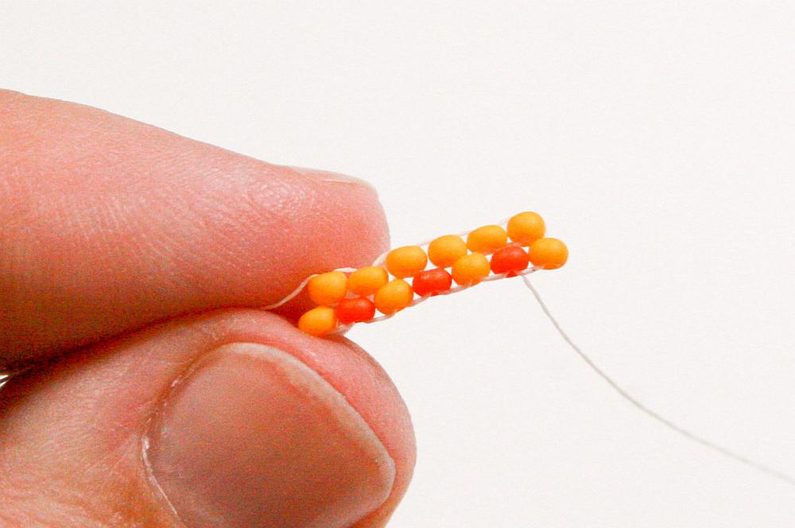 Šijeme další řadu korálků cihlovým stehem, střídáme PR10c a PR10d (Obr. 16–17). V další řadě budou jenom korálky PR10d (Obr. 18–19).