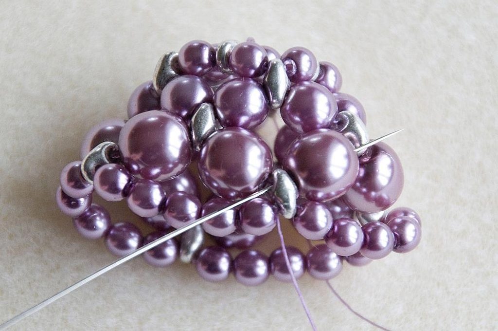 Prošijeme se skrz korálky zpět až k základnímu kolečku (pro posun do vyšší řady prošijeme vždy druhou dírku MS; Obr. 16). Konce nití svážeme a zapošijeme. Máme hotovou sukýnku (Obr. 17).