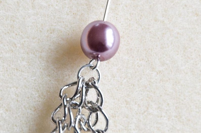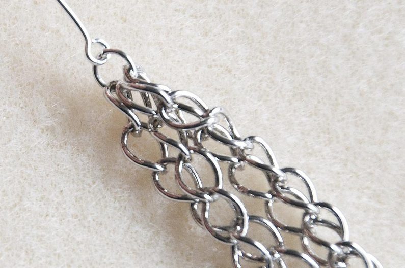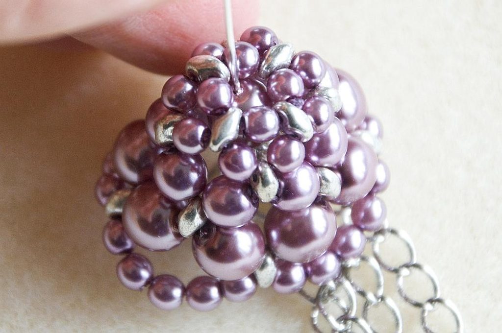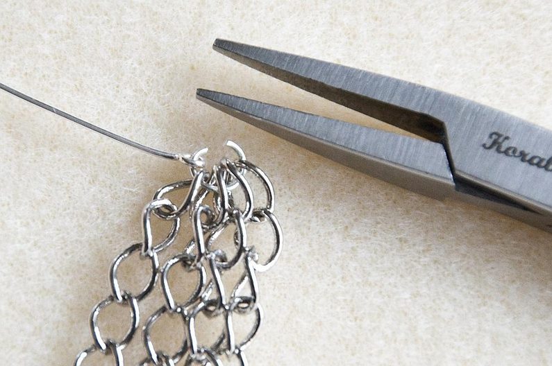 Vezmeme si ketlovací jehlu, plochými kleštěmi otevřeme očko a zavěsíme do něj odměřenou řetězovinu – tři až čtyři různě dlouhé řetízky. Pokud má ketlovací jehla moc malé očko, stačí přidat do očka jeden kroužek vel. 5 mm a řetízky zavěsit do kroužku (Obr. 18). Uzavřeme plochými kleštěmi (Obr. 19). Na jehlu navlékneme 1× VPK6 (Obr. 20). Provlékneme sukýnku zespodu (Obr. 21).