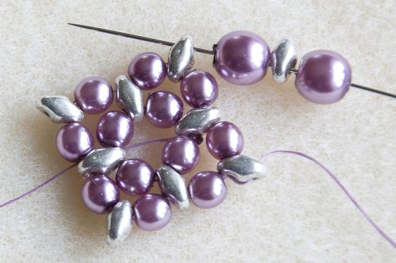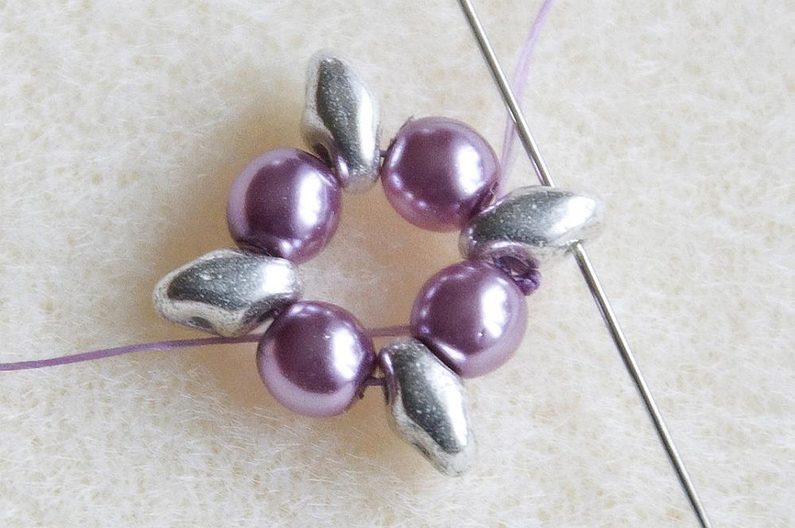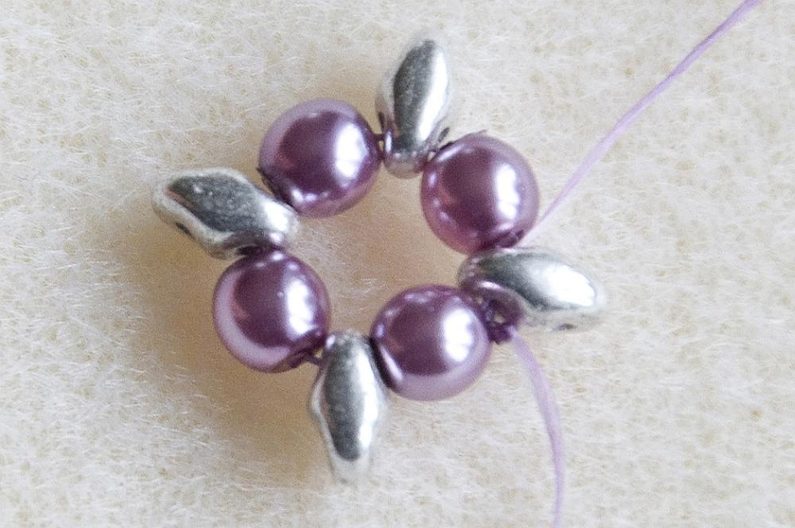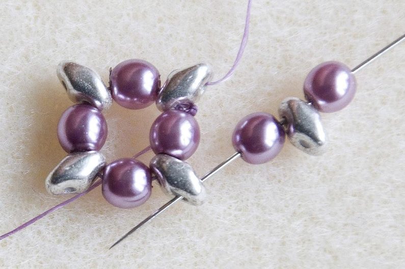 1. řada – Na nit dlouhou cca 75 cm navlékneme střídavě 1× MS a 1× VPK4, celkem 4× (Obr. 1). Provlékneme znovu všechny korálky (Obr. 2). Utáhneme a uděláme uzlík. Vznikne nám základní kolečko. Nit vychází z MS (Obr. 3).