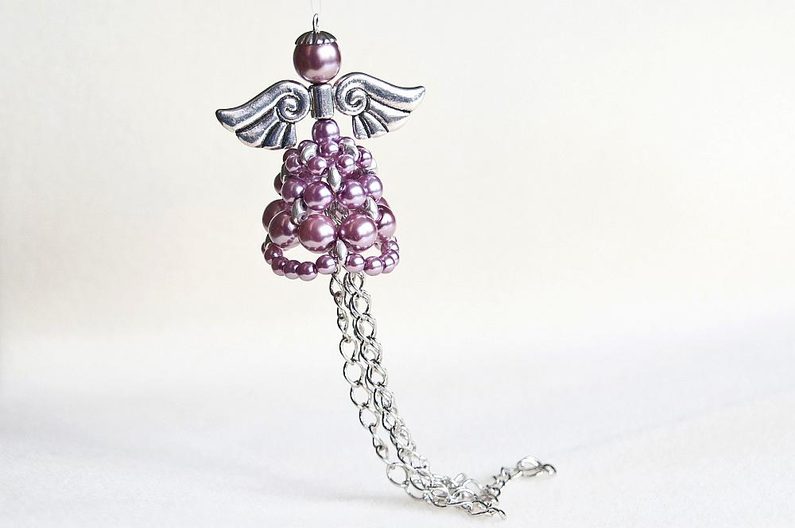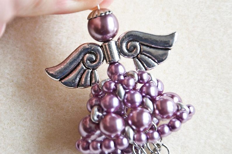 Shora na ketlovací jehlu navlékneme 1× VPK6, andělská křídla, 1× VPK10 a kaplík (Obr. 22). Ketlovacími kulatými kleštěmi uděláme nad hlavičkou očko (Obr. 23). Andílka můžeme za očko zavěsit jako ozdobu nebo si přidat do očka řetízek a nosit jako přívěsek na krku.