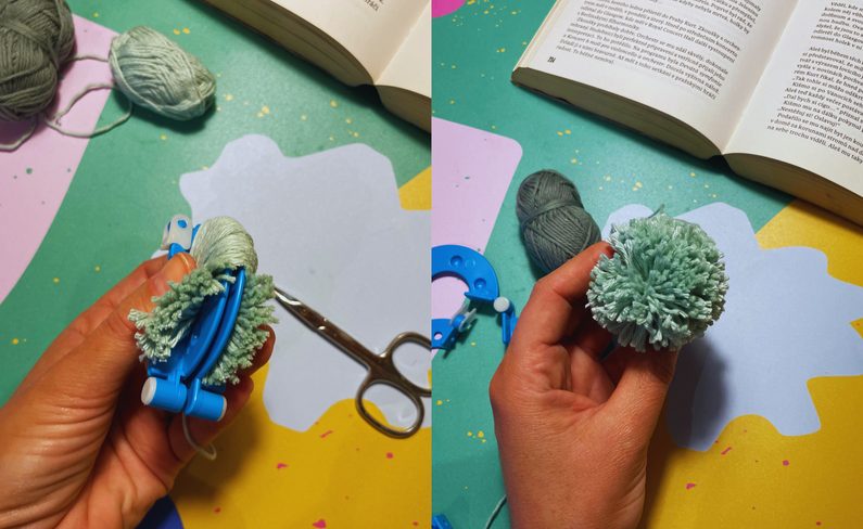 Po obvodu bavlny rozstříhnete a uprostřed svážete dohromady. Pomůcku sundáte a vznikne vám krásná bambulka. Nůžkami ji můžete začistit.