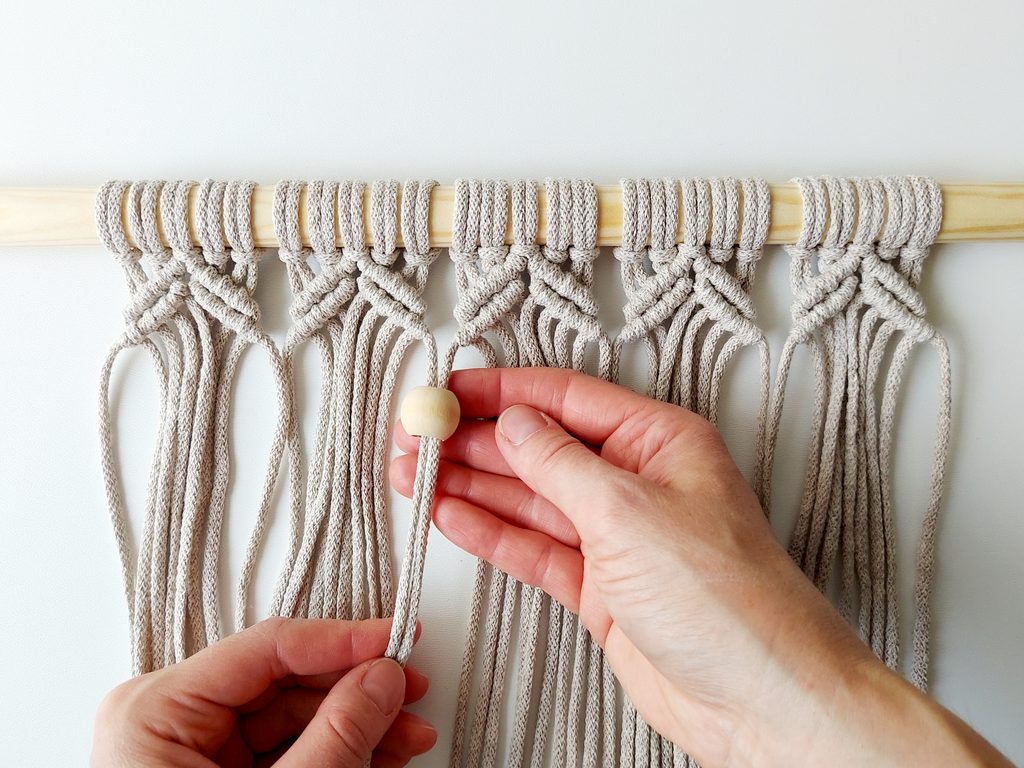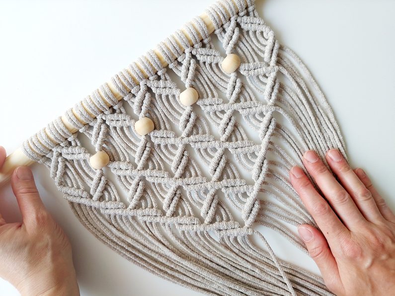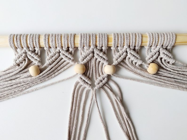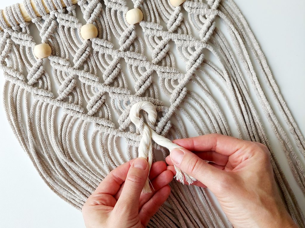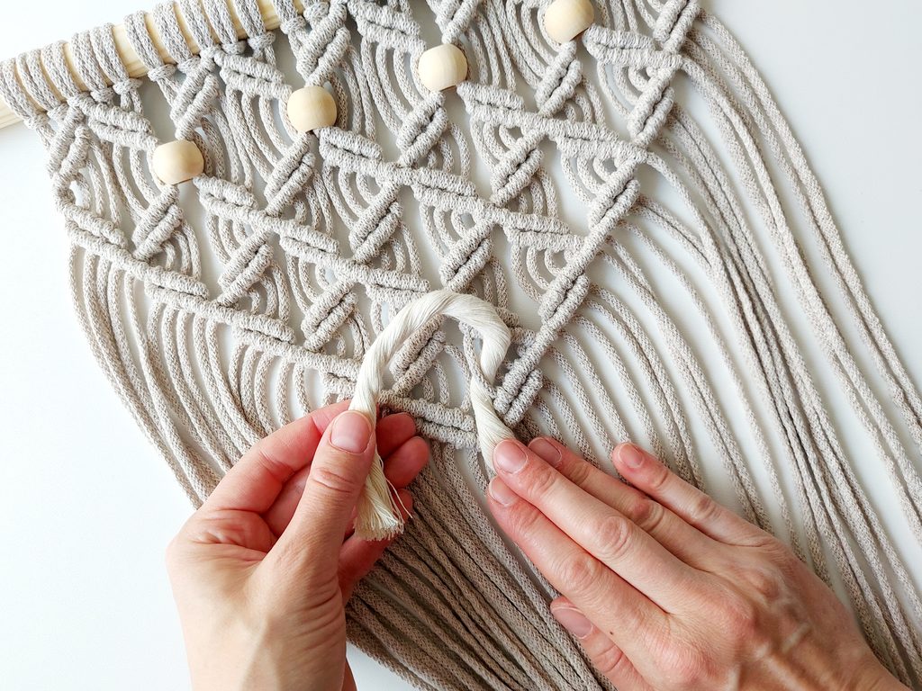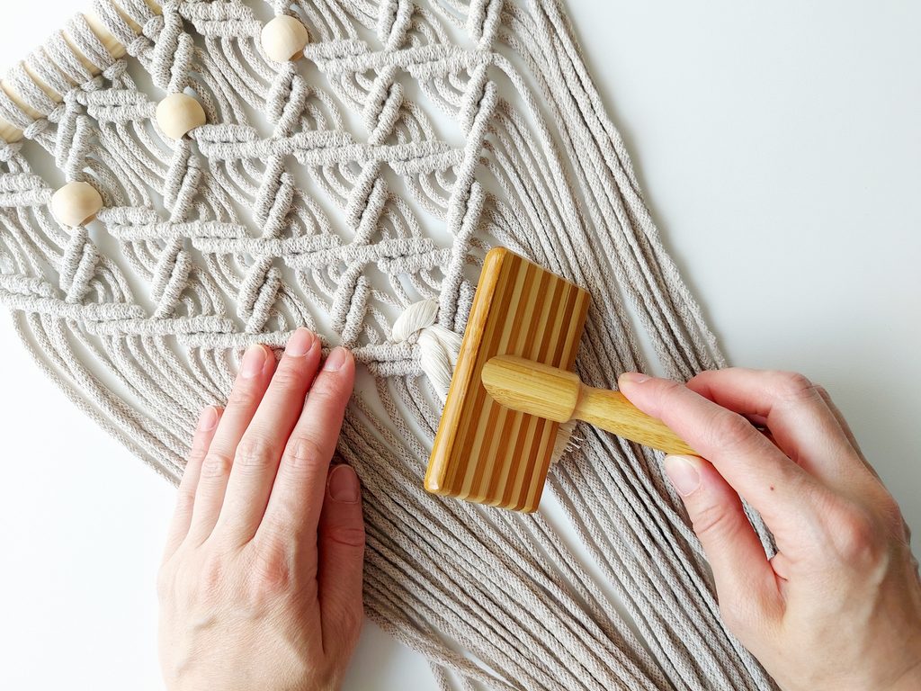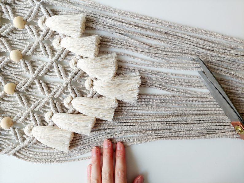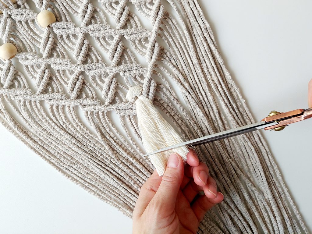 Střapec pomocí hřebínku nebo kartáče rozčešeme a zastříhneme. Zastřihneme i délku celého macramé a už stačí jen zavěsit na zeď.
