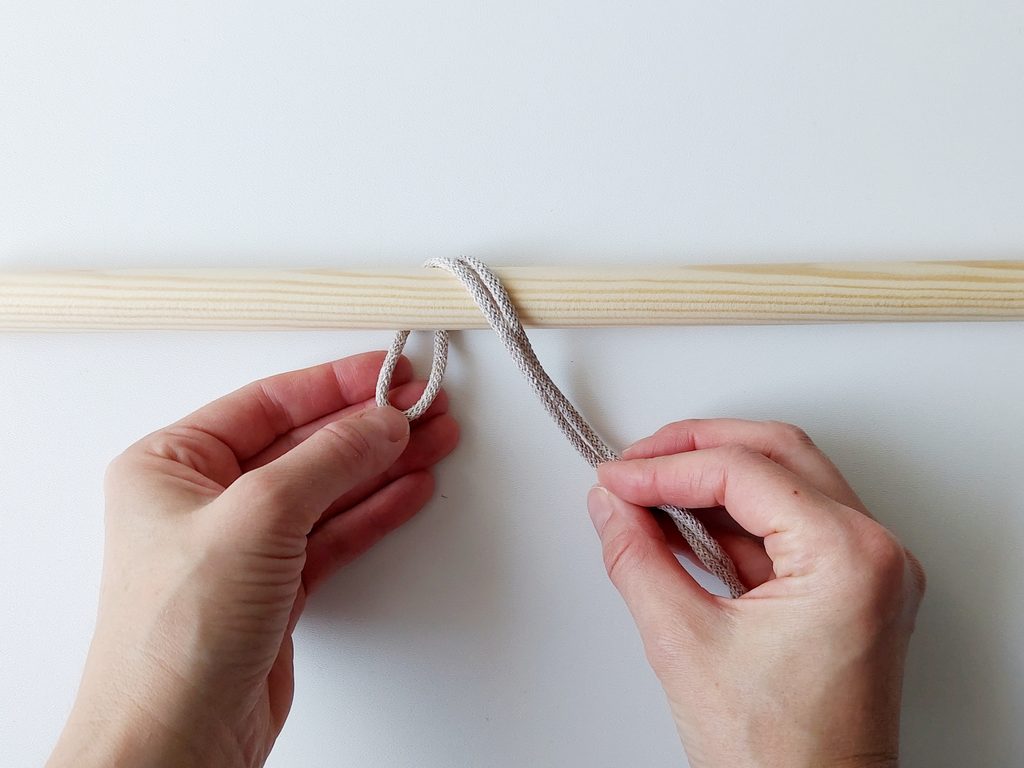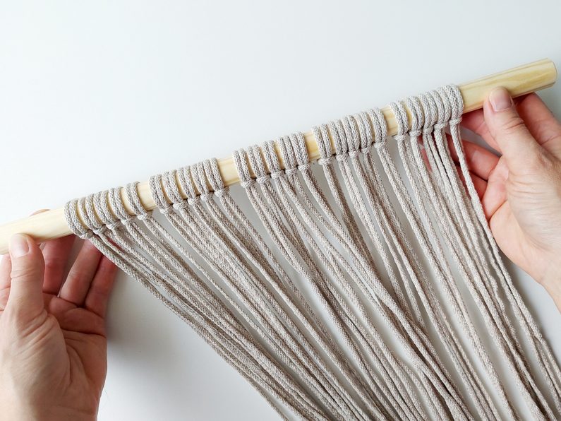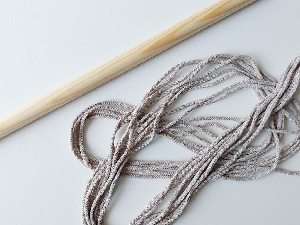 Připravíme si dřevěnou tyč nebo klacek o délce cca 40 cm a 25 kusů příze. 5 kusů o délce 2,8 m, 10 kusů o délce 2,5 m a 10 kusů o délce 2,2 m.