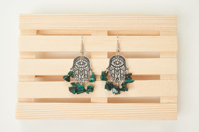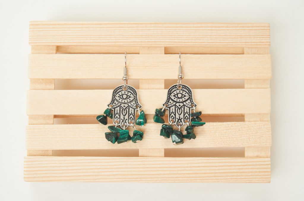 Na nýtové ketlovací jehly navlékneme zlomky malachitu a pomocí kulatých ketlovacích kleští vytvoříme očko, které zavěsíme na spojovací díl TierraCast. Očko ketlovací jehly poté úplně uzavřeme. Takto zavěsíme všechny ketlovací jehly do otvorů TierraCast Hamsa hand.