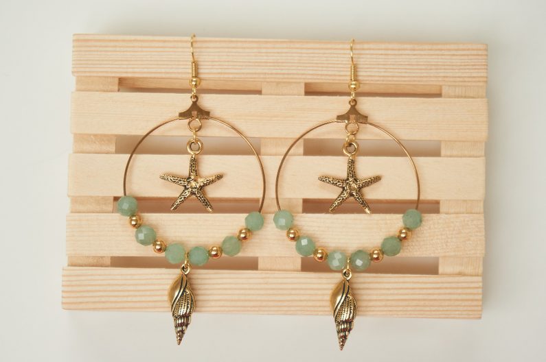 Otevřeme si naušnicovou kreoli, na kterou navlékneme broušené a kovové korálky a doprostřed na spojovacím kroužku navlékneme mušli TierraCast. Poté konec kreole zakápneme lepidlem a uzavřeme.