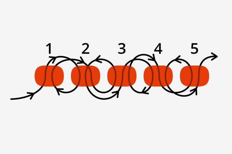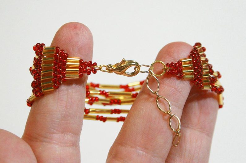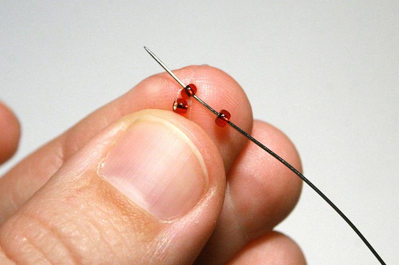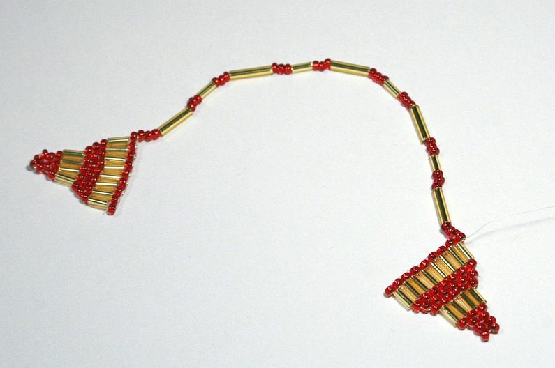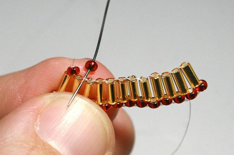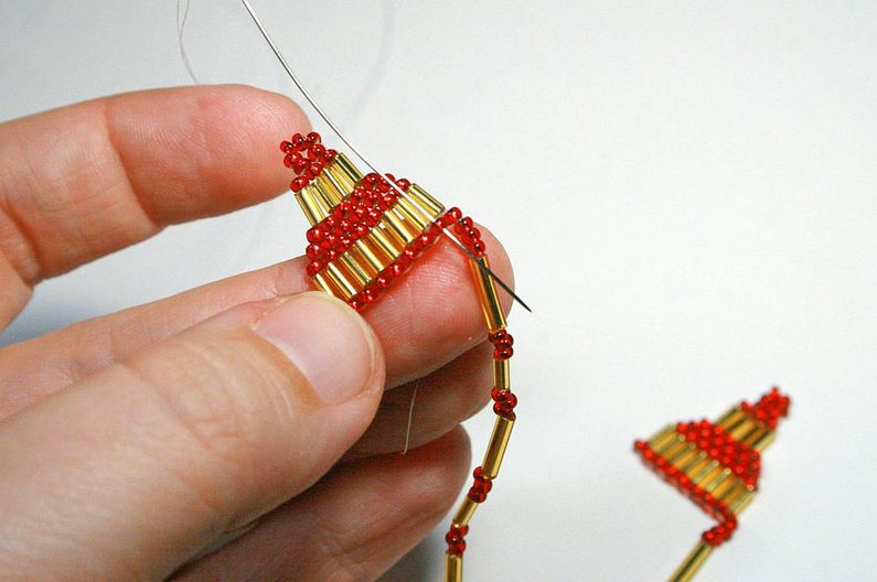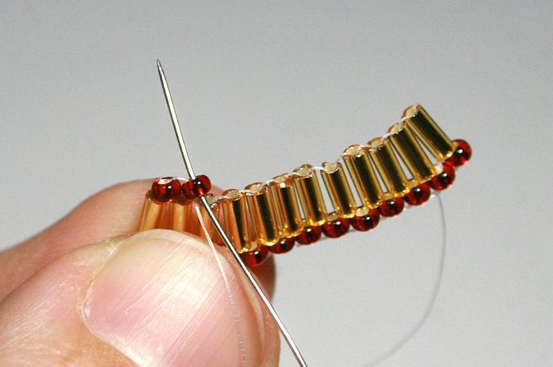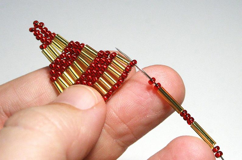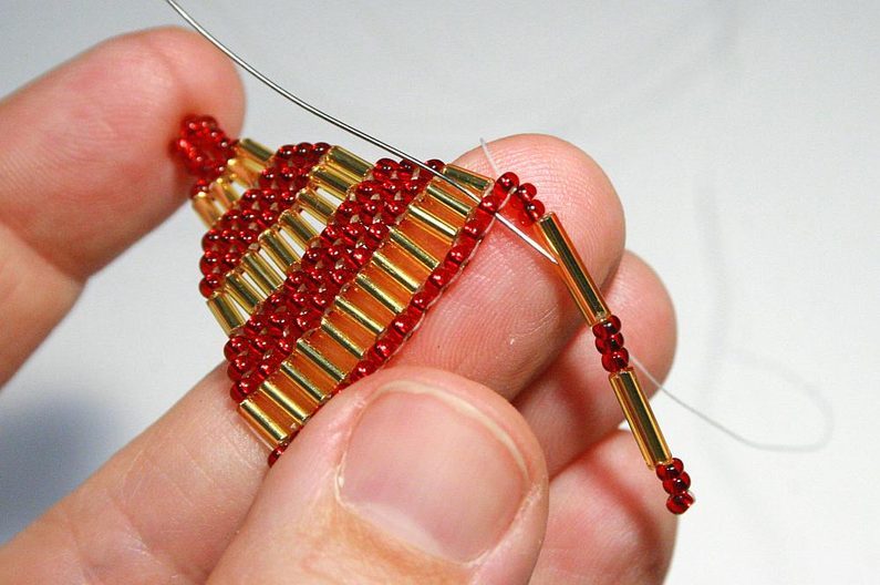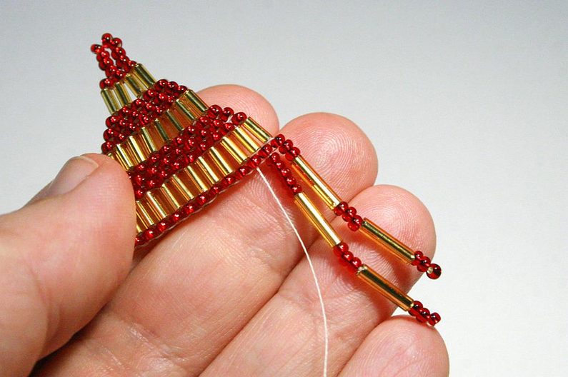 Ustřihneme cca 1,5m niti. Navlékneme 2 ks rokajlu PR10, potáhneme na konec niti a uděláme dvojitý uzlík (Obr.1). Ušijeme proužek podle diagramu 1 z třinácti rokajlu. (Obr. 2-5)