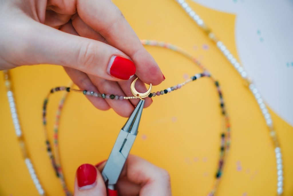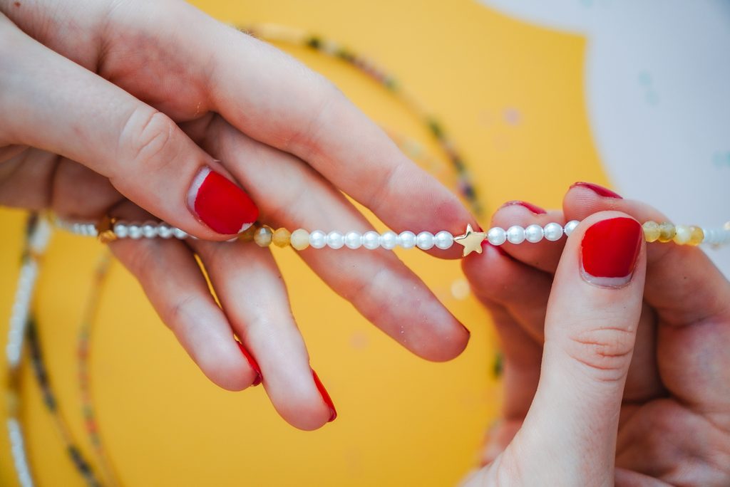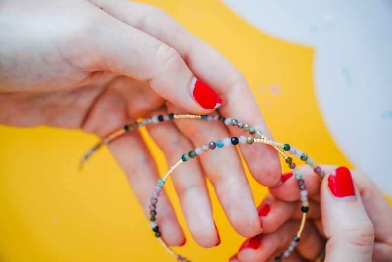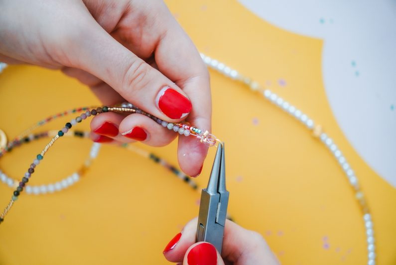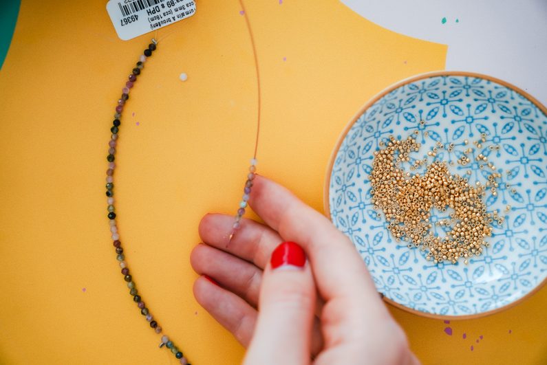 Lanko si vždy zakončíme očkem pomocí zamačkávacího rokajlu a navlékáme korálky. Střídáme druhy, barvy a vzory.