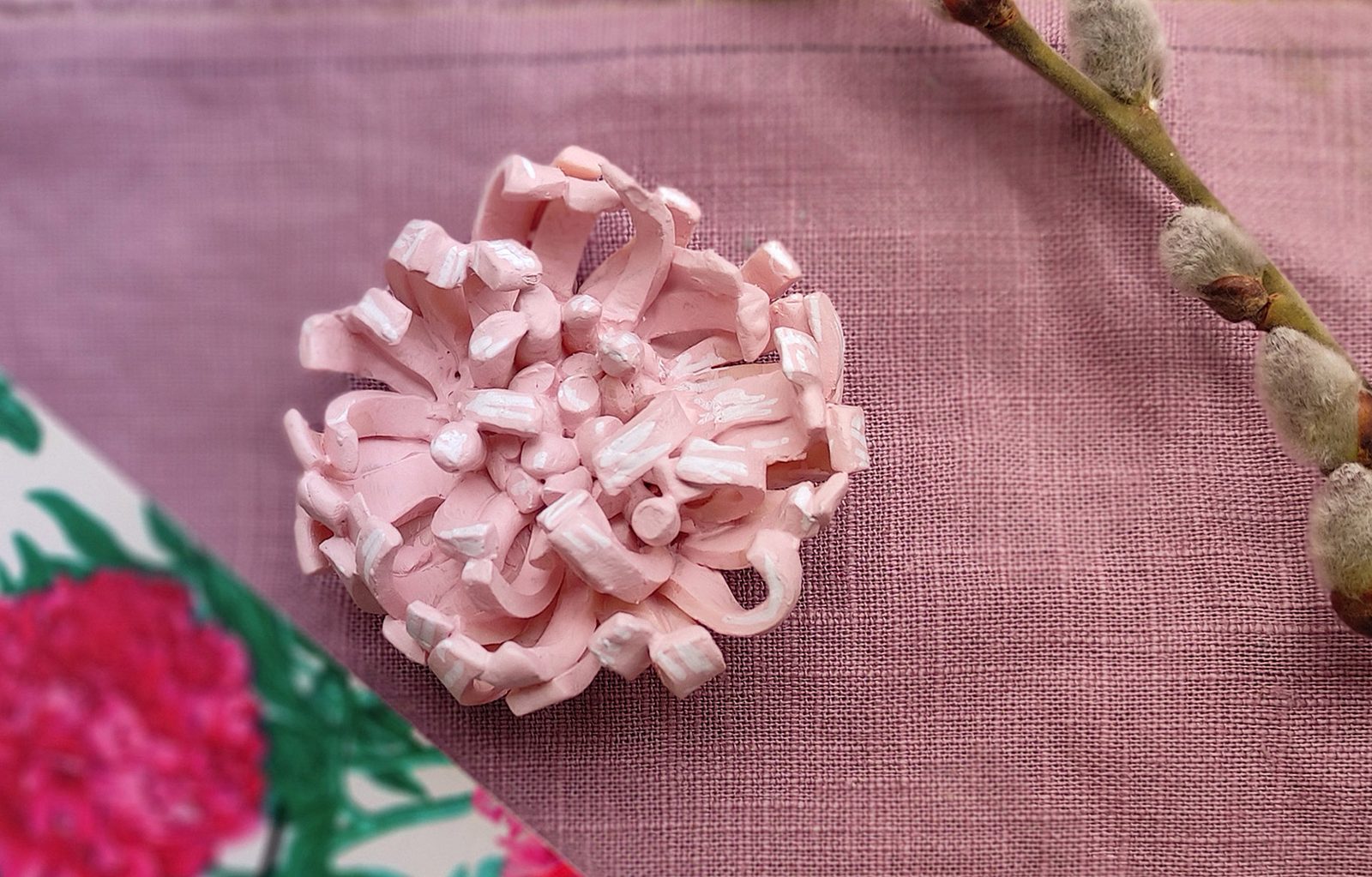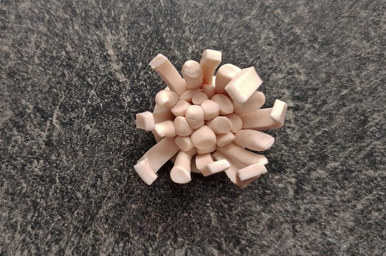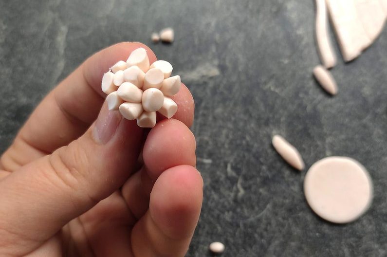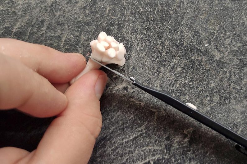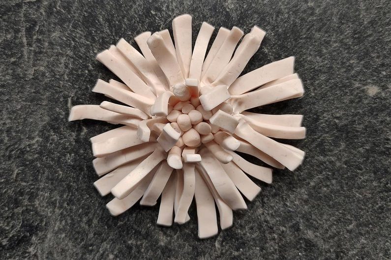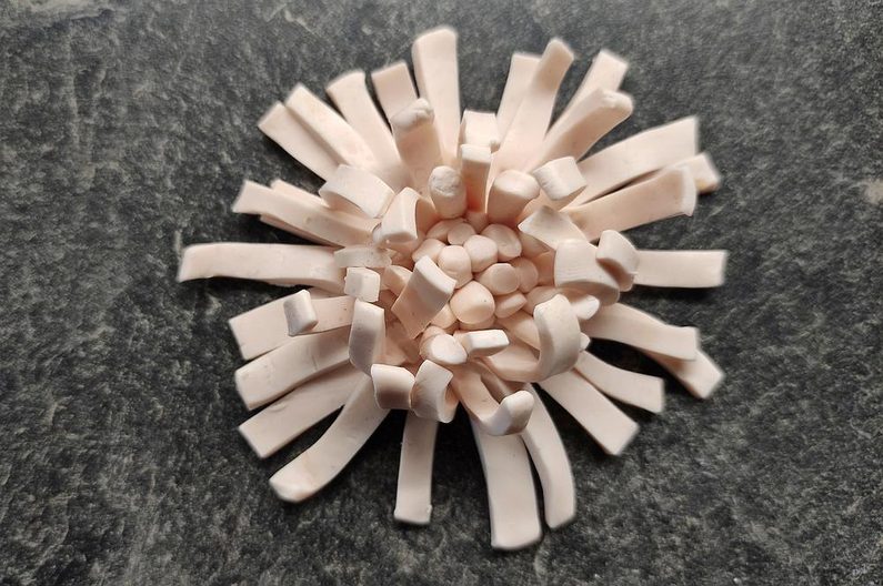 Pestíky postupně natvarováváme do jakési štětinky která nám slouží jako střed květiny. Opatrně ji seřízneme na požadovanou velikost a umístíme na střed placičky a jemně přitiskneme, na okrajích zapracujeme třeba špachtlí nebo jiným nástrojem, který si zvolíme.