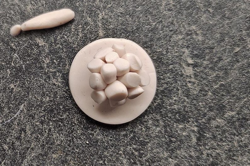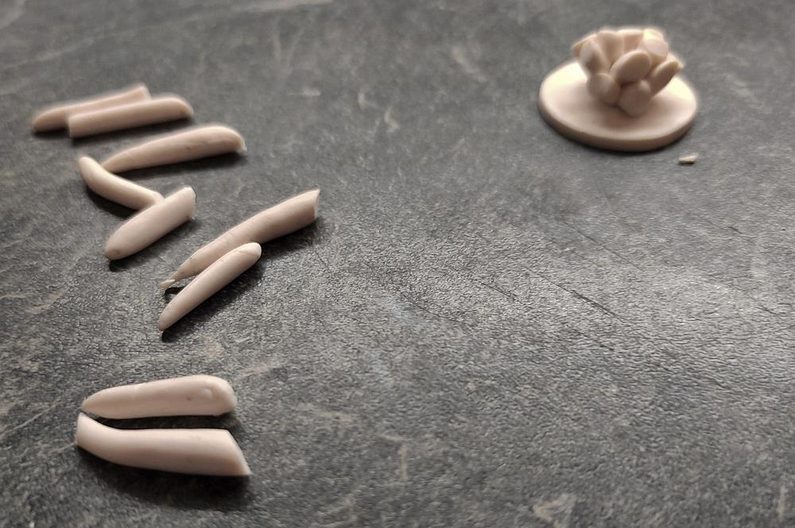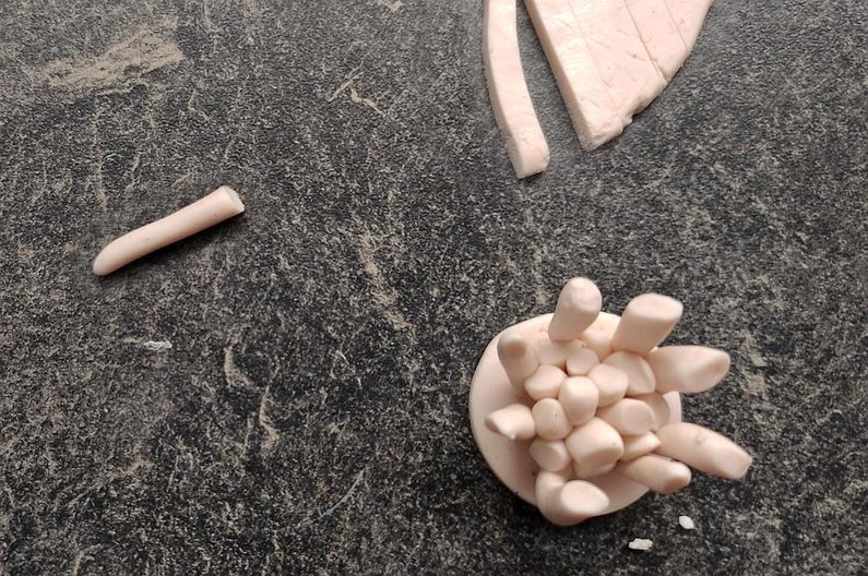 Ze zbytku placičky si vykrájíme zhruba 1,5 x 0,5 cm velké kousky, které svineme a natvarujeme do tvaru pestíků.