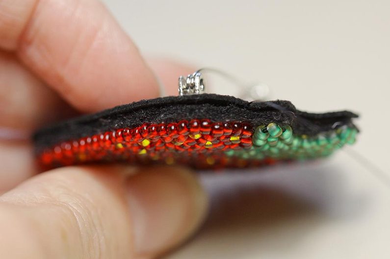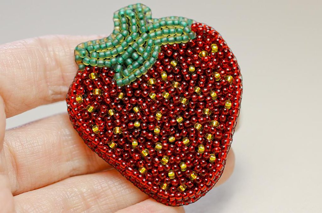 Nyní začneme vyplňovat jahodu rokajlem, zejména červeným PR10 a občas přidáme žlutý korálek PR10. Našíváme vždy 1 steh = 1 korálek, vedle sebe, různými směry. Poté odstřihneme přebytečný podklad.