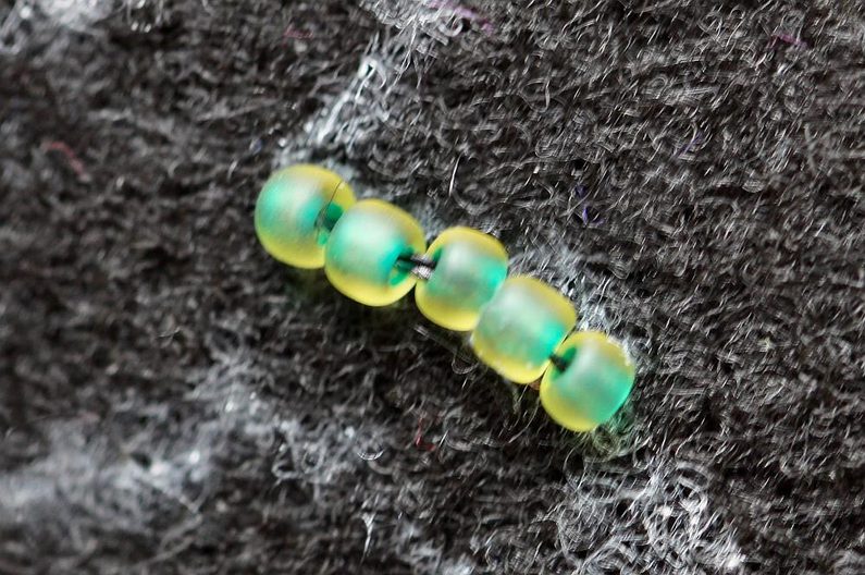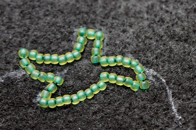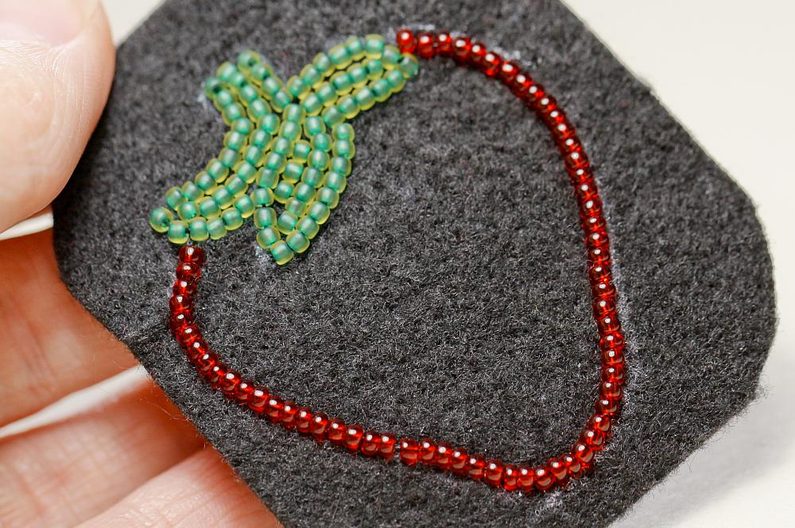 Stejným způsobem (2 korálky našít a o 3 se vrátit) vyšijeme obrys celé stopky. Podobně vyplníme i vnitřek, pokud zbudou mezírky, vyplníme je jednotlivými korálky.
