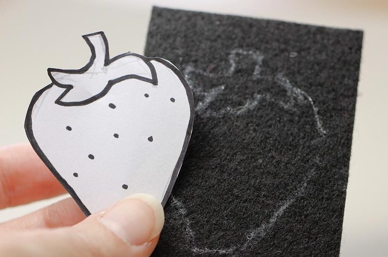 Na podklad pro šitý šperk si nakreslíme obrys jahody (můžeme použít nějakou šablonu nebo si jahodu nejdříve nakreslit na papír a pak překreslit na podklad).