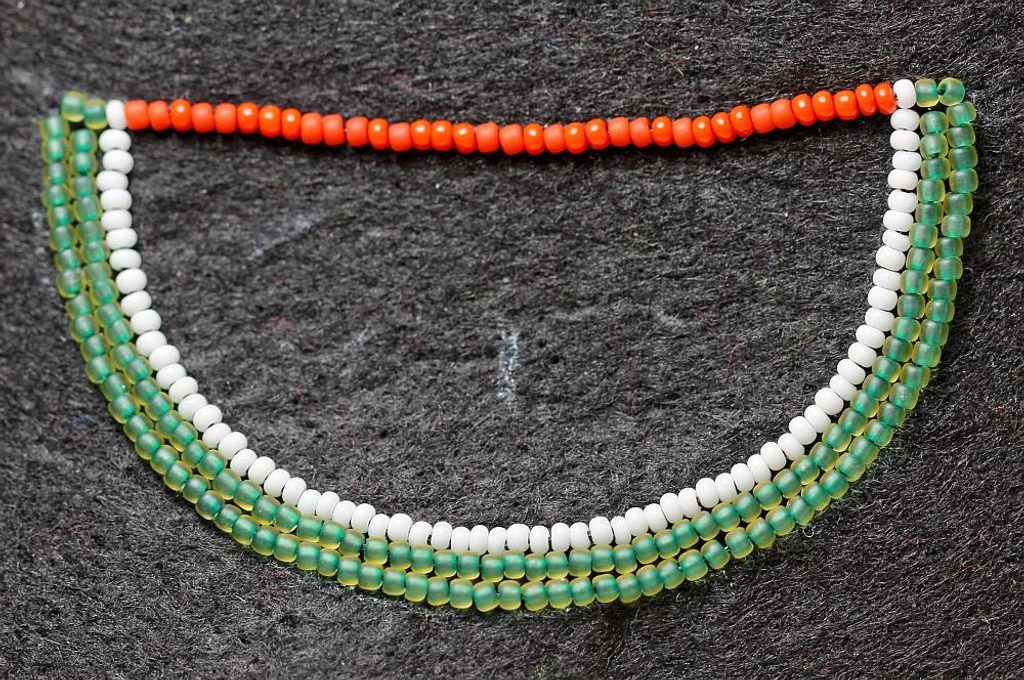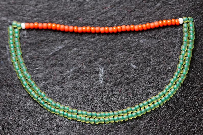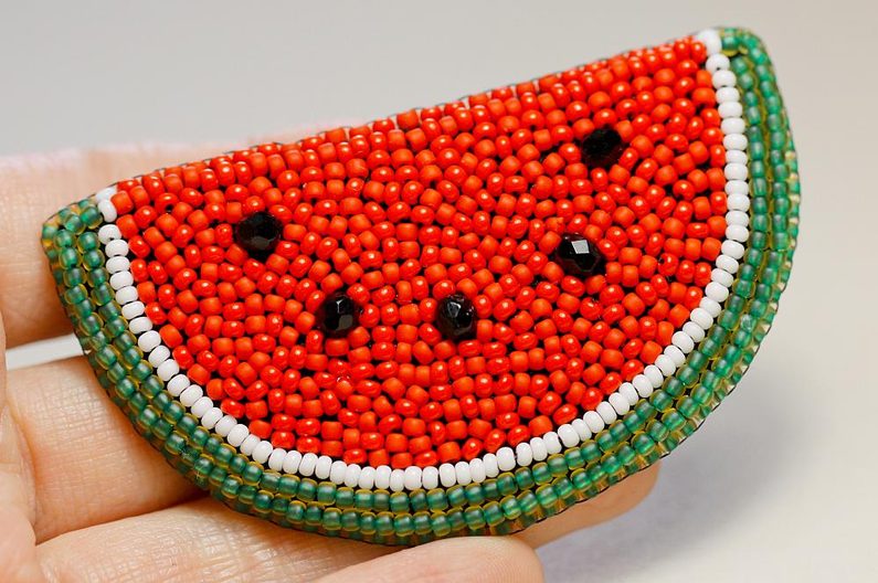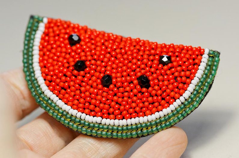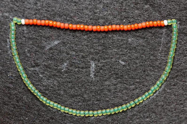 Na podklad pro šitý šperk si nakreslím obrys vykrojeného melounu (můžeme použít nějakou šablonu nebo si meloun nejdříve nakreslit na papír a pak překreslit na podklad). Začneme vyšívat obrys. Našijeme 3x TR11 a následně jehlu zespodu píchneme mezi první a druhý korálek. Jehlu vedeme druhým a třetím korálkem. Dále našijeme 2x TR11 a jehlou se vrátíme o tři korálky zpět, které opět znova provlékneme. Stejným způsobem (2 korálky našít a o 3 se vrátit) vyšijeme obrys (barvy dle fotografie).