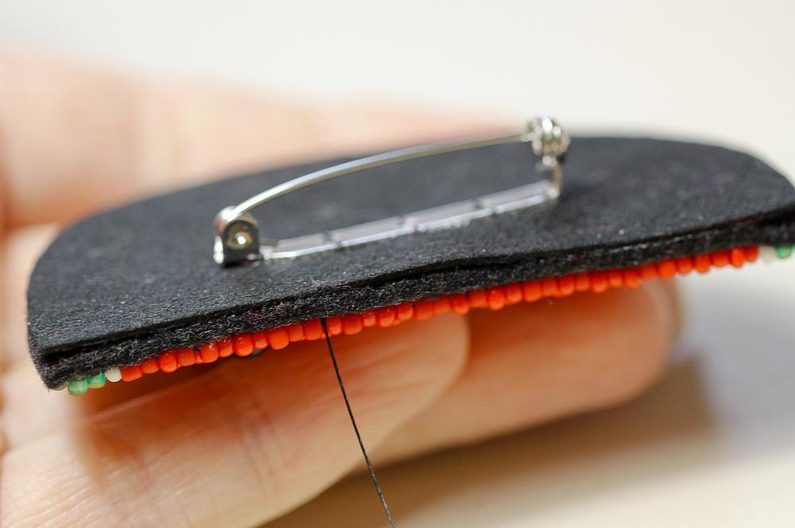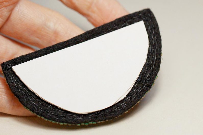 Vystřihneme si stejný tvar (jako původní) ze semišového podkladu, na který nejdříve jemně nalepíme a po zaschnutí několika stehy našijeme brožový můstek. Následně lepidlem přichytíme podklad k vyšitému melounku.