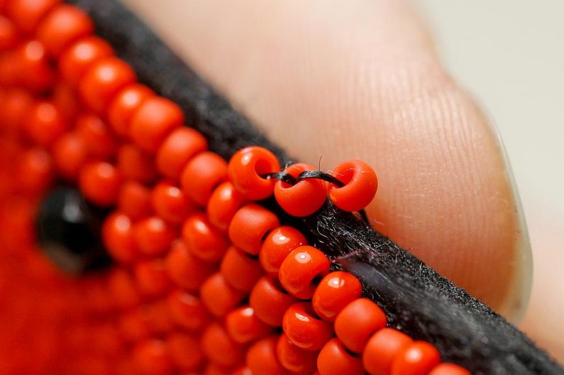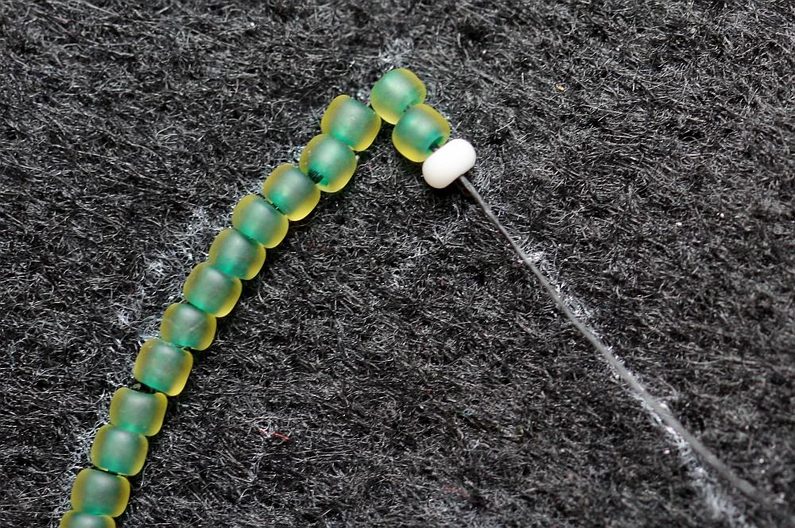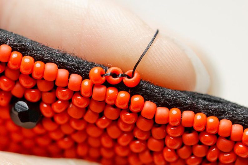 Začneme začišťovat – podšívat. Jehla nám vychází při kraji. Navlékneme 2x TR11 (nebo kombinaci s červených PR10) a našijeme na kraj.