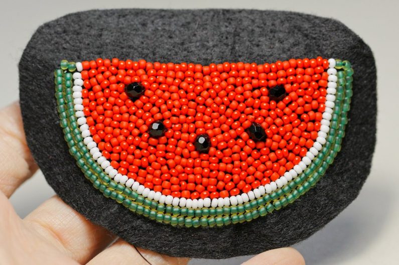Nyní začneme vyplňovat melounek rokajlem. Našíváme vždy 1 steh = 1 korálek, vedle sebe, různými směry. Poté odstřihneme přebytečný podklad.