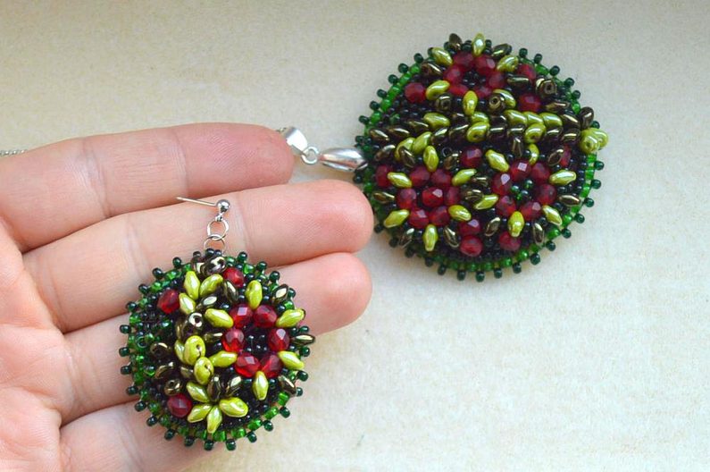 Aranžovala jsem větvičku diagonálně a pro dotvoření bohatosti jsem k podkladu přišívala spoustu zbylých broušených korálků a většího rokajlu. Stejně pak postupuji u náušnic. Je dobré aranžovat části zrcadlově.