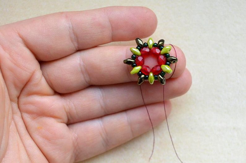 V další, poslední řadě navlékám jeden rokajlový korálek – tmavé Superduo-rokajlový korálek (velikost 10) a vyplňuji prostor mezi korálky v předešlé řadě. K protažení využívám spodní dírku korálku z druhé řady. Kytiček vytvořím celkem 5. Superdua vyjdou úplně přesně v celkové gramáži 10 gramů, broušené korálky ještě zbydou. Takže je můžu dále použít k výšivce.